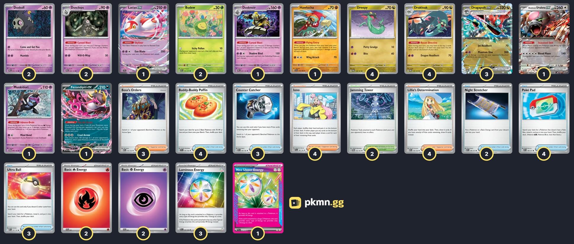 Pokémon: 23 4 Dreepy TWM 128 4 Drakloak TWM 129 3 Dragapult ex TWM 130 2 Duskull PRE 35 2 Dusclops PRE 36 1 Dusknoir PRE 37 2 Budew ASC 16 1 Hawlucha SVI 118 1 Munkidori TWM 95 1 Fezandipiti ex ASC 142 1 Latias ex SSP 76 1 Bloodmoon Ursaluna ex TWM 141 Trainer: 29 4 Lillie's Determination MEG 119 4 Iono PAL 185 3 Boss's Orders MEG 114 4 Buddy-Buddy Poffin TEF 144 4 Poké Pad ASC 198 3 Ultra Ball MEG 131 3 Counter Catcher PAR 160 2 Night Stretcher ASC 196 2 Jamming Tower TWM 153 Energy: 8 3 Luminous Energy PAL 191 2 Psychic Energy MEE 5 2 Fire Energy MEE 2 1 Neo Upper Energy TEF 162 |