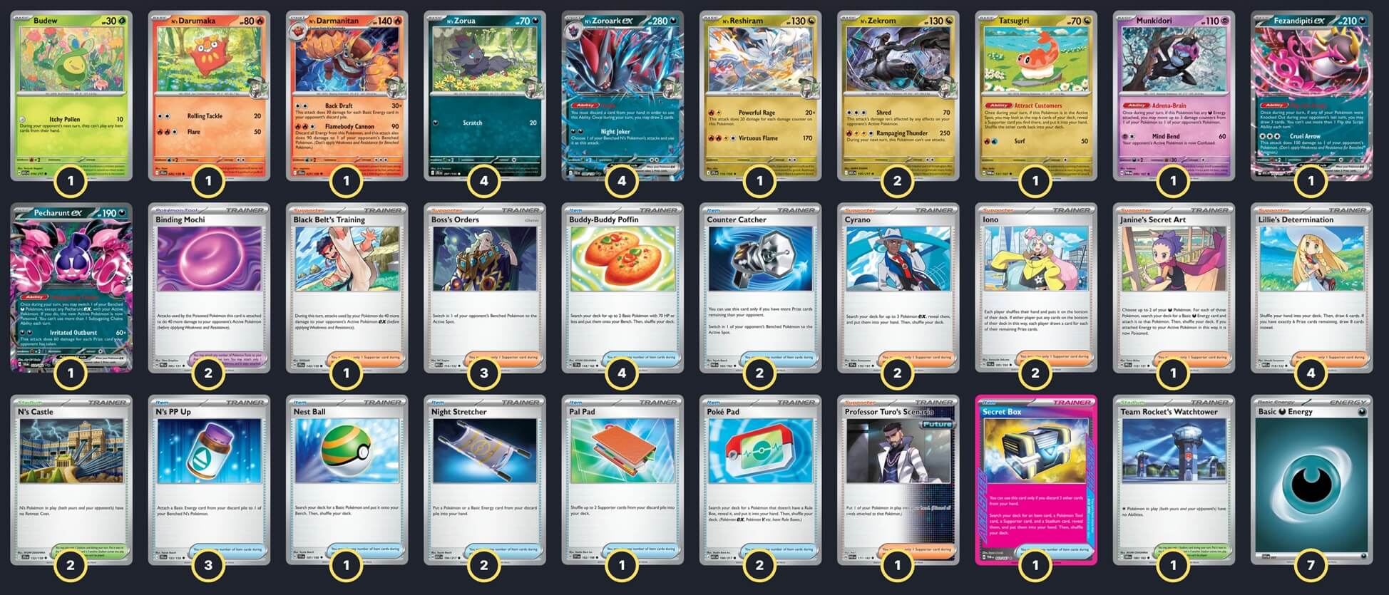 Pokémon: 18 4 N's Zorua JTG 97 4 N's Zoroark ex JTG 98 2 N's Zekrom ASC 155 1 N's Darumaka JTG 26 1 N's Darmanitan JTG 27 1 Munkidori TWM 95 1 Fezandipiti ex ASC 142 1 Pecharunt ex SFA 39 1 Budew ASC 16 1 Tatsugiri TWM 131 1 N's Reshiram JTG 116 Trainer: 35 4 Lillie's Determination MEG 119 3 Boss's Orders MEG 114 2 Iono PAL 185 2 Cyrano SSP 170 1 Professor Turo's Scenario PAR 171 1 Black Belt's Training JTG 143 1 Janine's Secret Art PRE 112 4 Buddy-Buddy Poffin TEF 144 3 N's PP Up JTG 153 2 Poké Pad ASC 198 2 Night Stretcher ASC 196 2 Counter Catcher PAR 160 1 Secret Box TWM 163 1 Nest Ball SVI 181 1 Pal Pad SVI 182 2 Binding Mochi PRE 95 2 N's Castle JTG 152 1 Team Rocket's Watchtower DRI 180 Energy: 7 7 Darkness Energy MEE 7 |