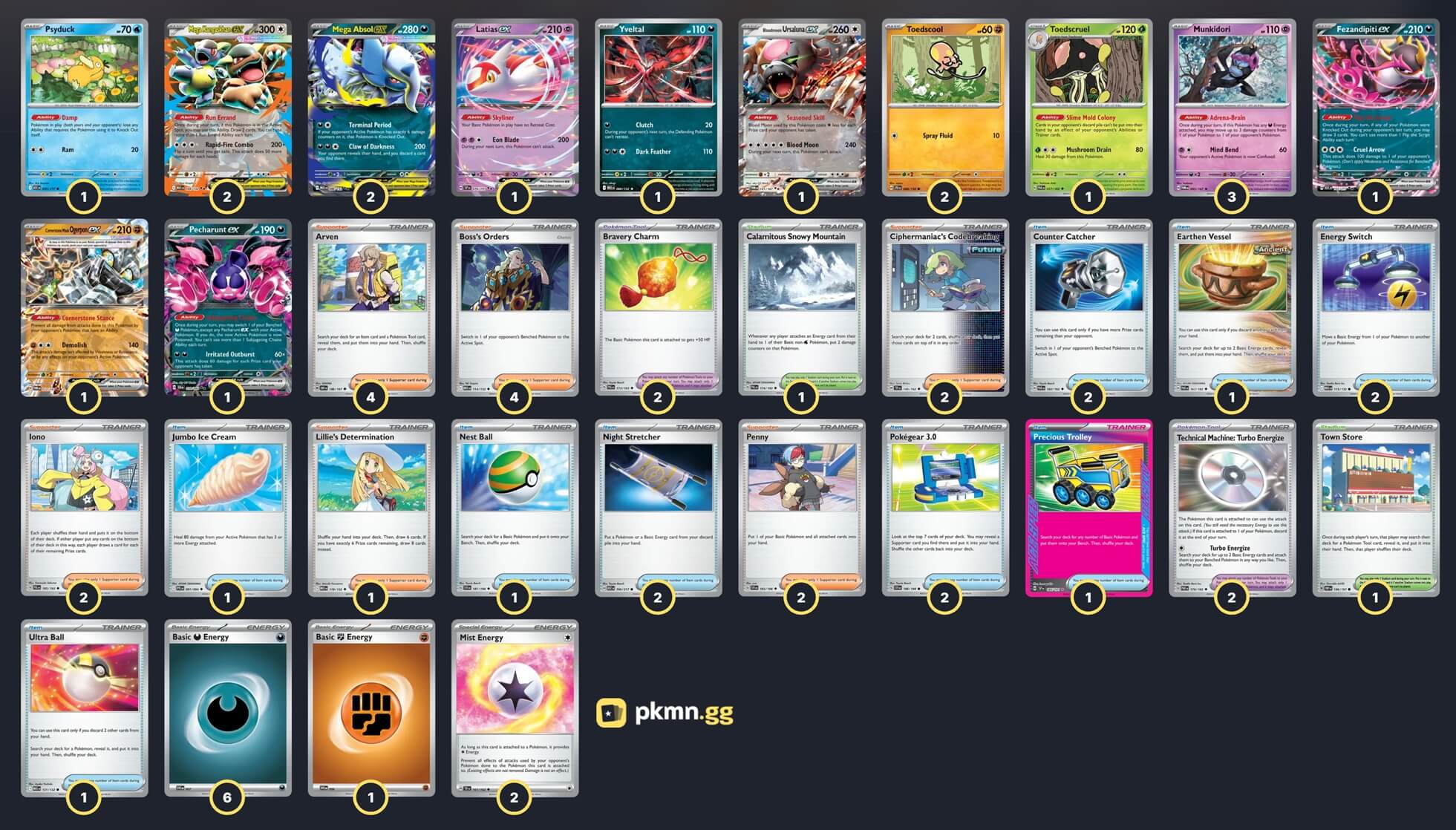 Pokémon: 17 3 Munkidori TWM 95 2 Toedscool JTG 88 1 Toedscruel PAR 17 2 Mega Absol ex MEG 86 2 Mega Kangaskhan ex MEG 104 1 Latias ex SSP 76 1 Psyduck ASC 39 1 Yveltal MEG 88 1 Bloodmoon Ursaluna ex TWM 141 1 Pecharunt ex SFA 39 1 Fezandipiti ex ASC 142 1 Cornerstone Mask Ogerpon ex TWM 112 Trainer: 34 4 Arven OBF 186 4 Boss's Orders MEG 114 2 Iono PAL 185 2 Ciphermaniac's Codebreaking TEF 145 2 Penny SVI 183 1 Lillie's Determination MEG 119 2 Night Stretcher ASC 196 2 Energy Switch MEG 115 2 Counter Catcher PAR 160 2 Pokégear 3.0 SVI 186 1 Precious Trolley SSP 185 1 Jumbo Ice Cream PFL 91 1 Nest Ball SVI 181 1 Ultra Ball MEG 131 1 Earthen Vessel PAR 163 2 Bravery Charm PAL 173 2 Technical Machine: Turbo Energize PAR 179 1 Calamitous Snowy Mountain PAL 174 1 Town Store OBF 196 Energy: 9 6 Darkness Energy MEE 7 2 Mist Energy TEF 161 1 Fighting Energy MEE 6 |
