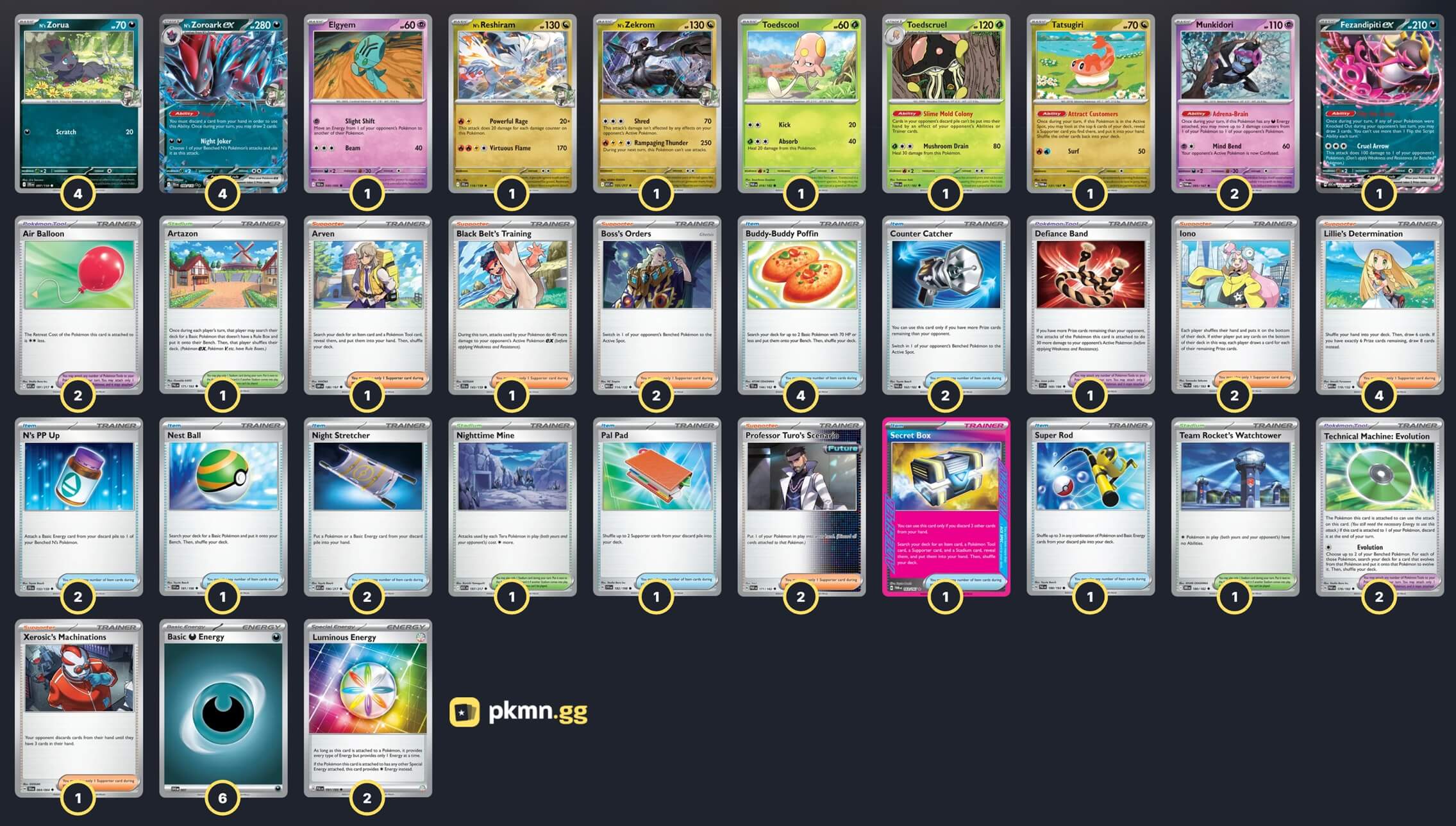 Pokémon: 17 4 N's Zorua JTG 97 4 N's Zoroark ex JTG 98 2 Munkidori TWM 95 1 N's Zekrom ASC 155 1 N's Reshiram JTG 116 1 Toedscool PAR 16 1 Toedscruel PAR 17 1 Elgyem BLK 40 1 Fezandipiti ex ASC 142 1 Tatsugiri TWM 131 Trainer: 35 4 Lillie's Determination MEG 119 2 Iono PAL 185 2 Boss's Orders MEG 114 2 Professor Turo's Scenario PAR 171 1 Arven OBF 186 1 Xerosic's Machinations SFA 64 1 Black Belt's Training JTG 143 4 Buddy-Buddy Poffin TEF 144 2 N's PP Up JTG 153 2 Counter Catcher PAR 160 2 Night Stretcher ASC 196 1 Super Rod PAL 188 1 Pal Pad SVI 182 1 Nest Ball SVI 181 1 Secret Box TWM 163 2 Technical Machine: Evolution PAR 178 2 Air Balloon ASC 181 1 Defiance Band SVI 169 1 Artazon PAL 171 1 Team Rocket's Watchtower DRI 180 1 Nighttime Mine ASC 197 Energy: 8 6 Darkness Energy MEE 7 2 Luminous Energy PAL 191 |
