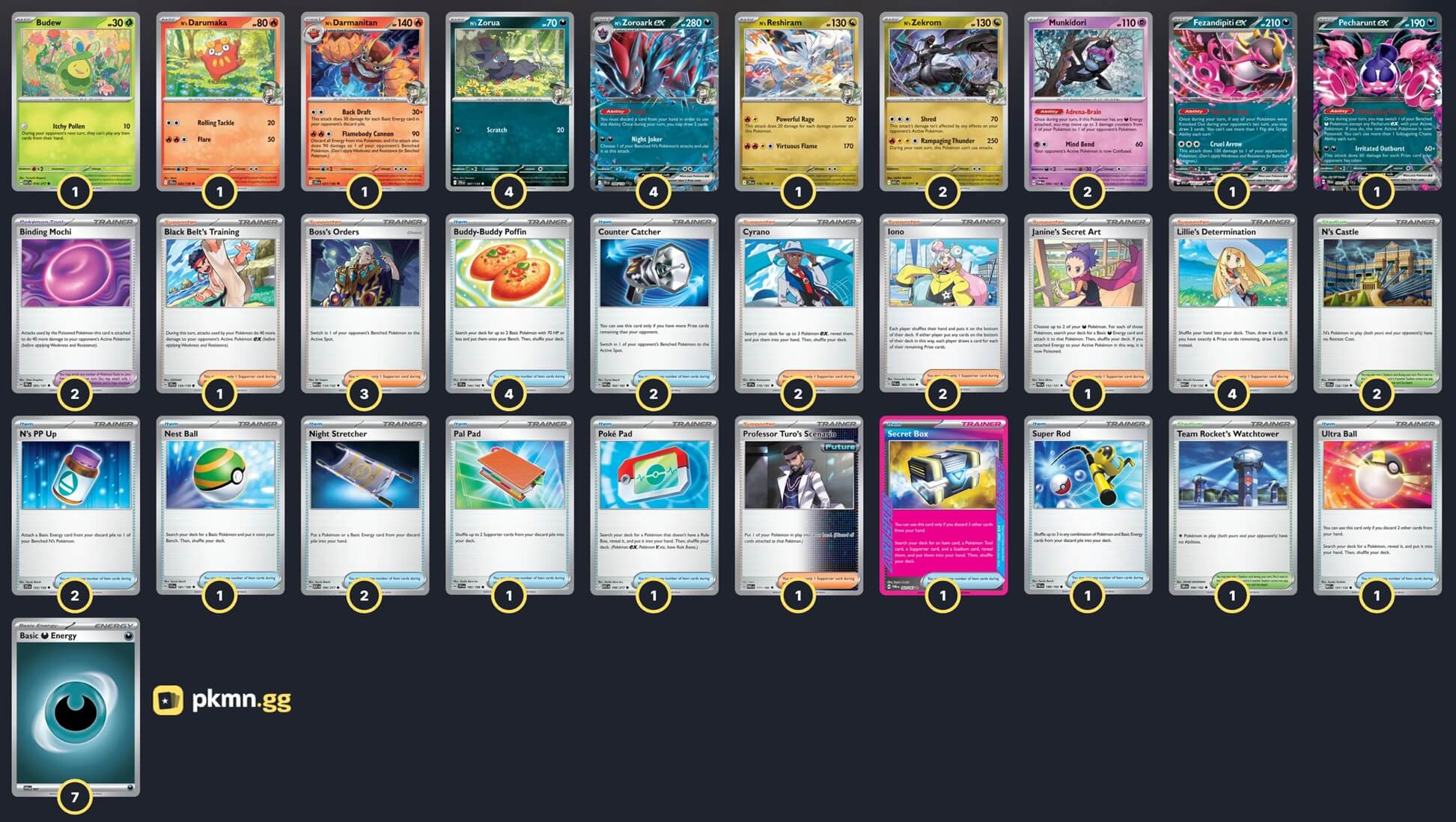 Pokémon: 18 4 N's Zorua JTG 97 4 N's Zoroark ex JTG 98 2 N's Zekrom ASC 155 2 Munkidori TWM 95 1 N's Darumaka JTG 26 1 N's Darmanitan JTG 27 1 N's Reshiram JTG 116 1 Fezandipiti ex ASC 142 1 Budew ASC 16 1 Pecharunt ex SFA 39 Trainer: 35 4 Lillie's Determination MEG 119 3 Boss's Orders MEG 114 2 Iono PAL 185 2 Cyrano SSP 170 1 Janine's Secret Art PRE 112 1 Professor Turo's Scenario PAR 171 1 Black Belt's Training JTG 143 4 Buddy-Buddy Poffin TEF 144 2 N's PP Up JTG 153 2 Night Stretcher ASC 196 2 Counter Catcher PAR 160 1 Poké Pad ASC 198 1 Nest Ball SVI 181 1 Ultra Ball MEG 131 1 Super Rod PAL 188 1 Pal Pad SVI 182 1 Secret Box TWM 163 2 Binding Mochi PRE 95 2 N's Castle JTG 152 1 Team Rocket's Watchtower DRI 180 Energy: 7 7 Darkness Energy MEE 7 |