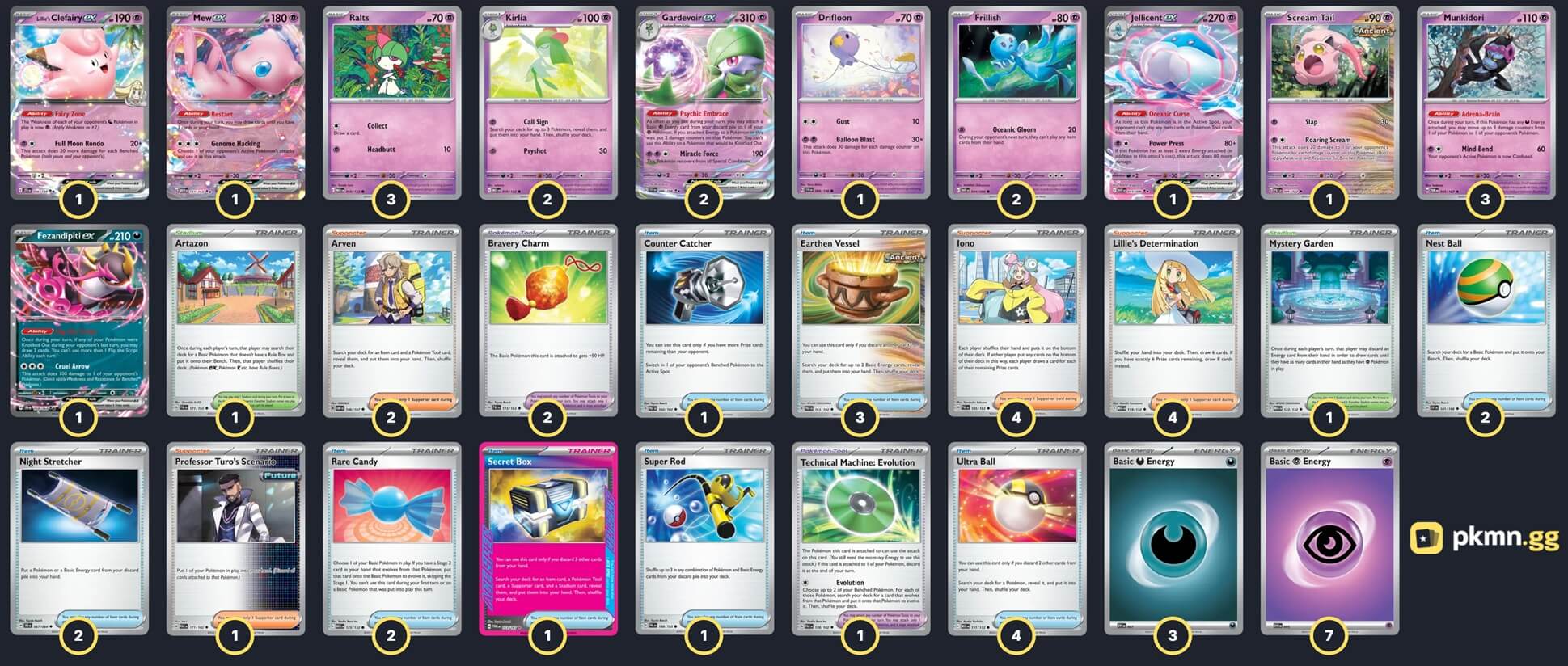 Pokémon: 16 3 Munkidori TWM 95 2 Yveltal MEG 88 2 Cornerstone Mask Ogerpon ex TWM 112 2 Mega Absol ex MEG 86 2 Mega Kangaskhan ex MEG 104 1 Latias ex SSP 76 1 Bloodmoon Ursaluna ex TWM 141 1 Psyduck MEP 7 1 Fezandipiti ex SFA 38 1 Pecharunt ex SFA 39 Trainer: 34 4 Arven OBF 186 4 Boss's Orders MEG 114 3 Lillie's Determination MEG 119 3 Penny SVI 183 2 Iono PAL 185 2 Nest Ball SVI 181 2 Earthen Vessel PAR 163 2 Night Stretcher SFA 61 2 Counter Catcher PAR 160 2 Pokégear 3.0 SVI 186 1 Precious Trolley SSP 185 1 Energy Switch MEG 115 2 Bravery Charm PAL 173 2 Technical Machine: Turbo Energize PAR 179 2 Lively Stadium SSP 180 Energy: 10 6 Darkness Energy SVE 23 2 Mist Energy TEF 161 2 Fighting Energy SVE 22 |