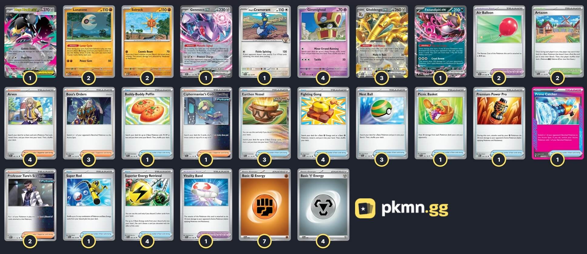 Pokémon: 15 4 Gimmighoul SSP 97 3 Gholdengo ex PAR 139 2 Lunatone MEG 74 2 Solrock MEG 75 1 Genesect ex BLK 67 1 Fezandipiti ex SFA 38 1 Hop's Cramorant JTG 138 1 Mega Mawile ex MEG 94 Trainer: 34 4 Arven OBF 186 3 Boss's Orders MEG 114 2 Professor Turo's Scenario PAR 171 1 Ciphermaniac's Codebreaking TEF 145 4 Superior Energy Retrieval PAL 189 4 Fighting Gong MEG 116 3 Nest Ball SVI 181 3 Earthen Vessel PAR 163 1 Prime Catcher TEF 157 1 Super Rod PAL 188 1 Picnic Basket SVI 184 1 Premium Power Pro MEG 124 1 Buddy-Buddy Poffin TEF 144 2 Air Balloon BLK 79 1 Vitality Band SVI 197 2 Artazon PAL 171 Energy: 11 7 Fighting Energy MEE 6 4 Metal Energy MEE 8 |
