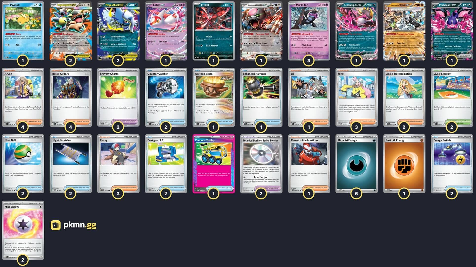 Pokémon: 14 3 Munkidori TWM 95 2 Mega Absol ex MEG 86 2 Mega Kangaskhan ex MEG 104 1 Psyduck MEP 7 1 Fezandipiti ex SFA 38 1 Latias ex SSP 76 1 Pecharunt ex SFA 39 1 Yveltal MEG 88 1 Bloodmoon Ursaluna ex TWM 141 1 Cornerstone Mask Ogerpon ex TWM 112 Trainer: 37 4 Arven OBF 186 4 Boss's Orders MEG 114 3 Penny SVI 183 3 Iono PAL 185 2 Lillie's Determination MEG 119 1 Eri TEF 146 1 Xerosic's Machinations SFA 64 2 Counter Catcher PAR 160 2 Pokégear 3.0 SVI 186 2 Night Stretcher SFA 61 2 Nest Ball SVI 181 2 Energy Switch MEG 115 1 Precious Trolley SSP 185 1 Enhanced Hammer TWM 148 1 Earthen Vessel PAR 163 2 Bravery Charm PAL 173 2 Technical Machine: Turbo Energize PAR 179 2 Lively Stadium SSP 180 Energy: 9 6 Darkness Energy MEE 7 2 Mist Energy TEF 161 1 Fighting Energy MEE 6 |