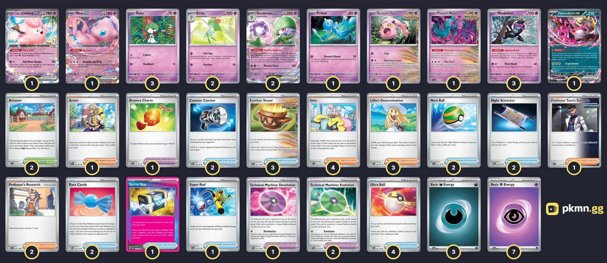 Pokémon: 16 3 Ralts MEG 58 2 Kirlia MEG 59 2 Gardevoir ex SVI 86 3 Munkidori TWM 95 1 Mew ex MEW 151 1 Lillie's Clefairy ex JTG 56 1 Scream Tail PAR 86 1 Fezandipiti ex SFA 38 1 Flutter Mane TEF 78 1 Frillish WHT 44 Trainer: 34 4 Iono PAL 185 3 Lillie's Determination MEG 119 2 Professor's Research JTG 155 1 Professor Turo's Scenario PAR 171 1 Arven OBF 186 4 Ultra Ball MEG 131 3 Earthen Vessel PAR 163 2 Night Stretcher SFA 61 2 Nest Ball SVI 181 2 Counter Catcher PAR 160 2 Rare Candy MEG 125 1 Super Rod PAL 188 1 Secret Box TWM 163 2 Technical Machine: Evolution PAR 178 1 Technical Machine: Devolution PAR 177 1 Bravery Charm PAL 173 2 Artazon PAL 171 Energy: 10 7 Psychic Energy SVE 21 3 Darkness Energy SVE 23 |