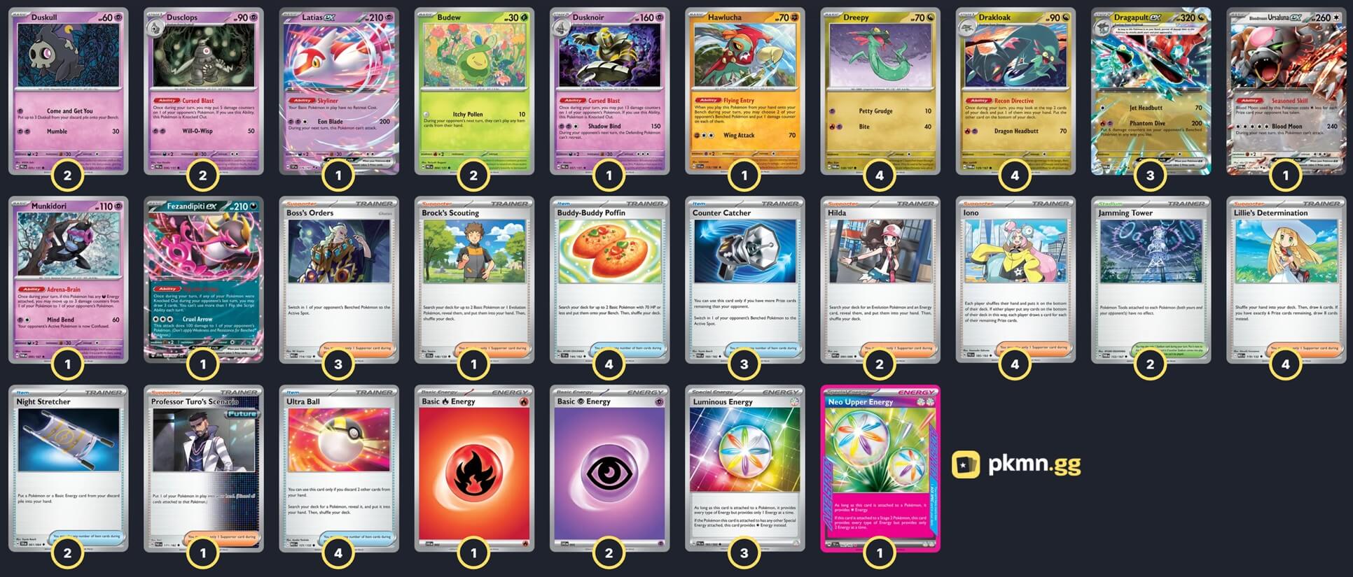 Pokémon: 23 4 Dreepy TWM 128 4 Drakloak TWM 129 3 Dragapult ex TWM 130 2 Duskull PRE 35 2 Dusclops PRE 36 1 Dusknoir PRE 37 2 Budew PRE 4 1 Munkidori TWM 95 1 Hawlucha SVI 118 1 Bloodmoon Ursaluna ex TWM 141 1 Latias ex SSP 76 1 Fezandipiti ex SFA 38 Trainer: 30 4 Lillie's Determination MEG 119 4 Iono PAL 185 3 Boss's Orders MEG 114 2 Hilda WHT 84 1 Brock's Scouting JTG 146 1 Professor Turo's Scenario PAR 171 4 Ultra Ball MEG 131 4 Buddy-Buddy Poffin TEF 144 3 Counter Catcher PAR 160 2 Night Stretcher SFA 61 2 Jamming Tower TWM 153 Energy: 7 3 Luminous Energy PAL 191 2 Psychic Energy SVE 21 1 Fire Energy SVE 18 1 Neo Upper Energy TEF 162 |