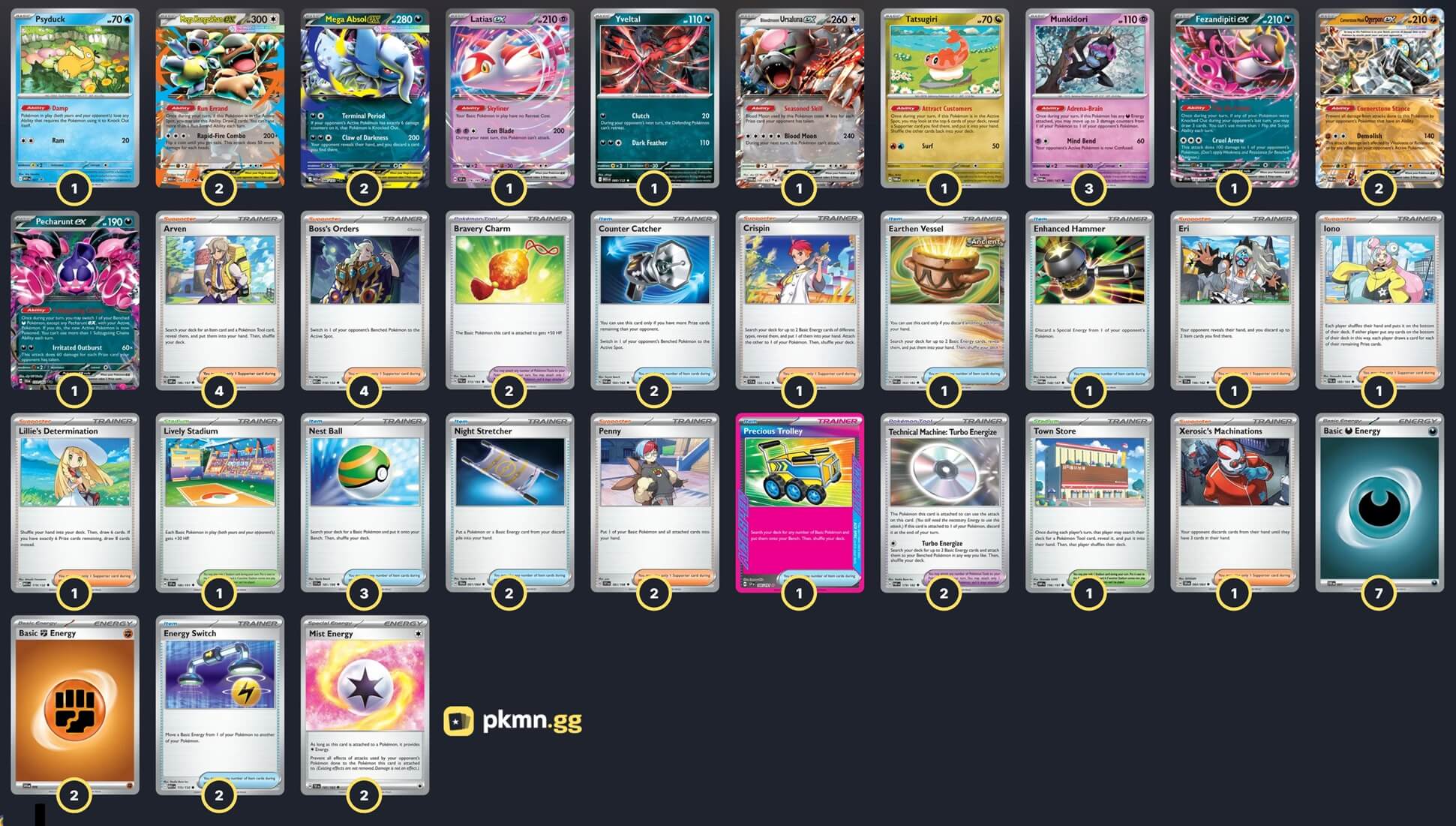 Pokémon: 16 3 Munkidori TWM 95 2 Cornerstone Mask Ogerpon ex TWM 112 2 Mega Absol ex MEG 86 2 Mega Kangaskhan ex MEG 104 1 Psyduck MEP 7 1 Latias ex SSP 76 1 Fezandipiti ex SFA 38 1 Pecharunt ex SFA 39 1 Yveltal MEG 88 1 Tatsugiri TWM 131 1 Bloodmoon Ursaluna ex TWM 141 Trainer: 33 4 Arven OBF 186 4 Boss's Orders MEG 114 2 Penny SVI 183 1 Crispin SCR 133 1 Eri TEF 146 1 Iono PAL 185 1 Lillie's Determination MEG 119 1 Xerosic's Machinations SFA 64 3 Nest Ball SVI 181 2 Counter Catcher PAR 160 2 Energy Switch MEG 115 2 Night Stretcher SFA 61 1 Enhanced Hammer TWM 148 1 Precious Trolley SSP 185 1 Earthen Vessel PAR 163 2 Bravery Charm PAL 173 2 Technical Machine: Turbo Energize PAR 179 1 Town Store OBF 196 1 Lively Stadium SSP 180 Energy: 11 7 Darkness Energy SVE 23 2 Mist Energy TEF 161 2 Fighting Energy SVE 22 |