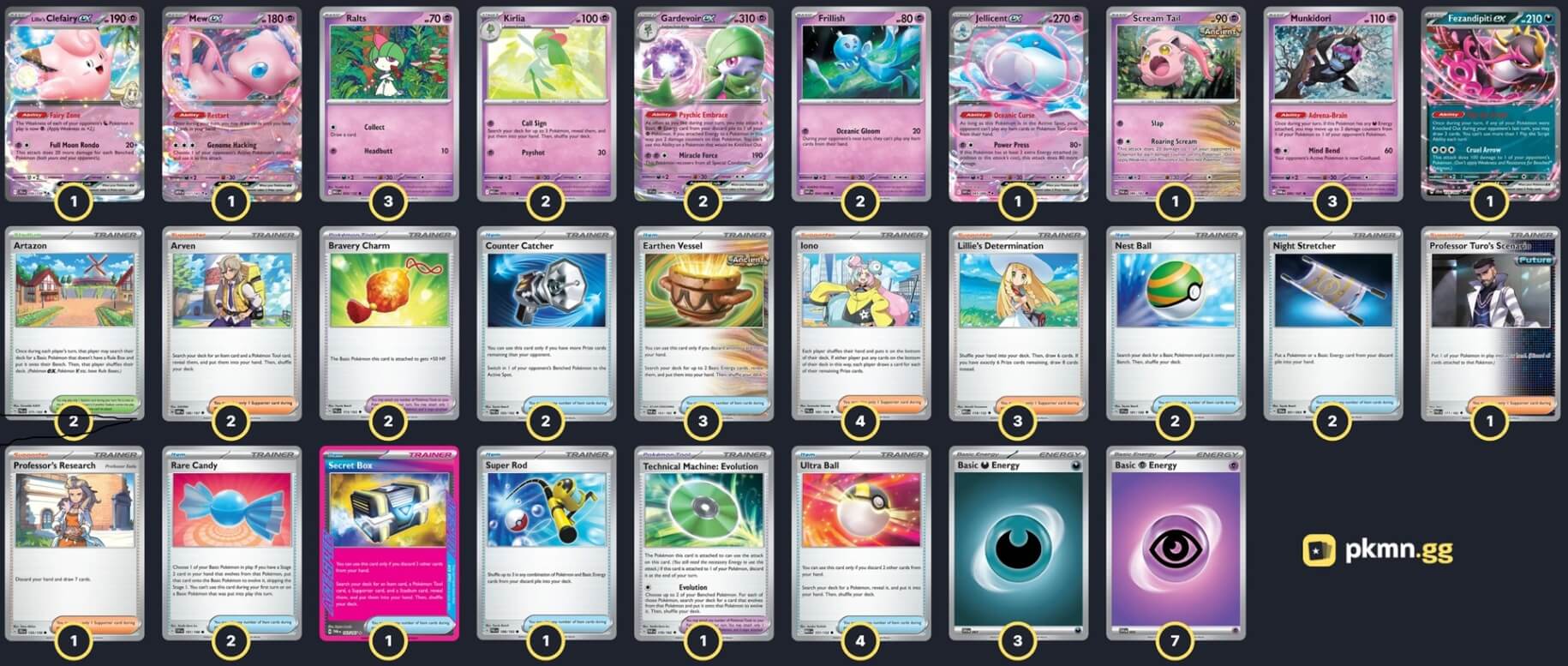 Pokémon: 17 3 Ralts MEG 58 2 Kirlia MEG 59 2 Gardevoir ex SVI 86 3 Munkidori TWM 95 2 Frillish WHT 44 1 Jellicent ex WHT 45 1 Fezandipiti ex SFA 38 1 Lillie's Clefairy ex JTG 56 1 Mew ex MEW 151 1 Scream Tail PAR 86 Trainer: 33 4 Iono PAL 185 3 Lillie's Determination MEG 119 2 Arven OBF 186 1 Professor's Research JTG 155 1 Professor Turo's Scenario PAR 171 4 Ultra Ball MEG 131 3 Earthen Vessel PAR 163 2 Nest Ball SVI 181 2 Counter Catcher PAR 160 2 Rare Candy MEG 125 2 Night Stretcher SFA 61 1 Secret Box TWM 163 1 Super Rod PAL 188 2 Bravery Charm PAL 173 1 Technical Machine: Evolution PAR 178 2 Artazon PAL 171 Energy: 10 7 Psychic Energy SVE 21 3 Darkness Energy SVE 23 |