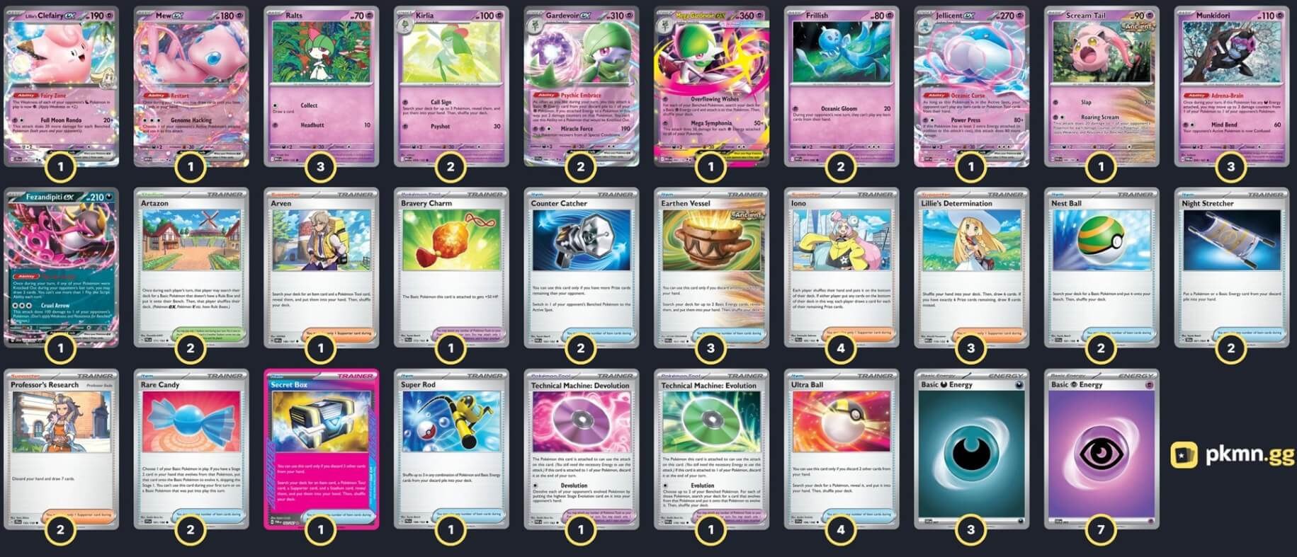 Pokémon: 18 3 Ralts MEG 58 2 Kirlia MEG 59 2 Gardevoir ex SVI 86 1 Mega Gardevoir ex MEG 60 3 Munkidori TWM 95 2 Frillish WHT 44 1 Jellicent ex WHT 45 1 Scream Tail PAR 86 1 Mew ex MEW 151 1 Lillie's Clefairy ex JTG 56 1 Fezandipiti ex SFA 38 Trainer: 32 4 Iono PAL 185 3 Lillie's Determination MEG 119 2 Professor's Research JTG 155 1 Arven OBF 186 4 Ultra Ball MEG 131 3 Earthen Vessel PAR 163 2 Rare Candy MEG 125 2 Nest Ball SVI 181 2 Counter Catcher PAR 160 2 Night Stretcher SFA 61 1 Secret Box TWM 163 1 Super Rod PAL 188 1 Bravery Charm PAL 173 1 Technical Machine: Evolution PAR 178 1 Technical Machine: Devolution PAR 177 2 Artazon PAL 171 Energy: 10 7 Psychic Energy SVE 21 3 Darkness Energy SVE 23 |
