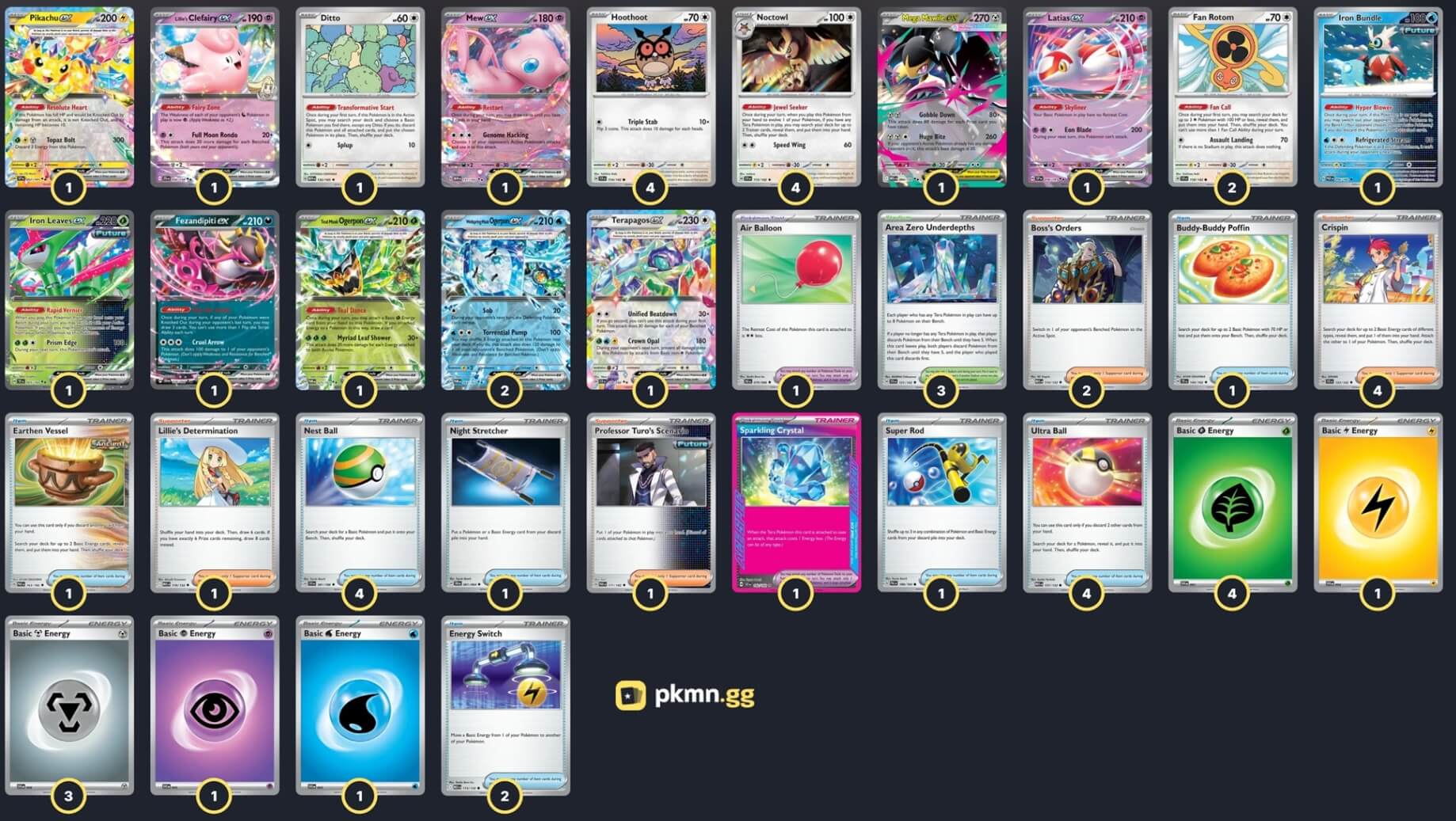 Pokémon: 23 4 Hoothoot SCR 114 4 Noctowl SCR 115 2 Fan Rotom SCR 118 2 Wellspring Mask Ogerpon ex TWM 64 1 Pikachu ex SSP 57 1 Teal Mask Ogerpon ex TWM 25 1 Terapagos ex SCR 128 1 Lillie's Clefairy ex JTG 56 1 Mega Mawile ex MEG 94 1 Iron Leaves ex TEF 25 1 Latias ex SSP 76 1 Mew ex MEW 151 1 Fezandipiti ex SFA 38 1 Iron Bundle PAR 56 1 Ditto MEW 132 Trainer: 27 4 Crispin SCR 133 2 Boss's Orders MEG 114 1 Professor Turo's Scenario PAR 171 1 Lillie's Determination MEG 119 4 Nest Ball SVI 181 4 Ultra Ball MEG 131 2 Energy Switch MEG 115 1 Night Stretcher SFA 61 1 Buddy-Buddy Poffin TEF 144 1 Super Rod PAL 188 1 Earthen Vessel PAR 163 1 Sparkling Crystal SCR 142 1 Air Balloon BLK 79 3 Area Zero Underdepths SCR 131 Energy: 10 4 Grass Energy SVE 17 3 Metal Energy SVE 24 1 Water Energy SVE 19 1 Lightning Energy SVE 20 1 Psychic Energy SVE 21 |