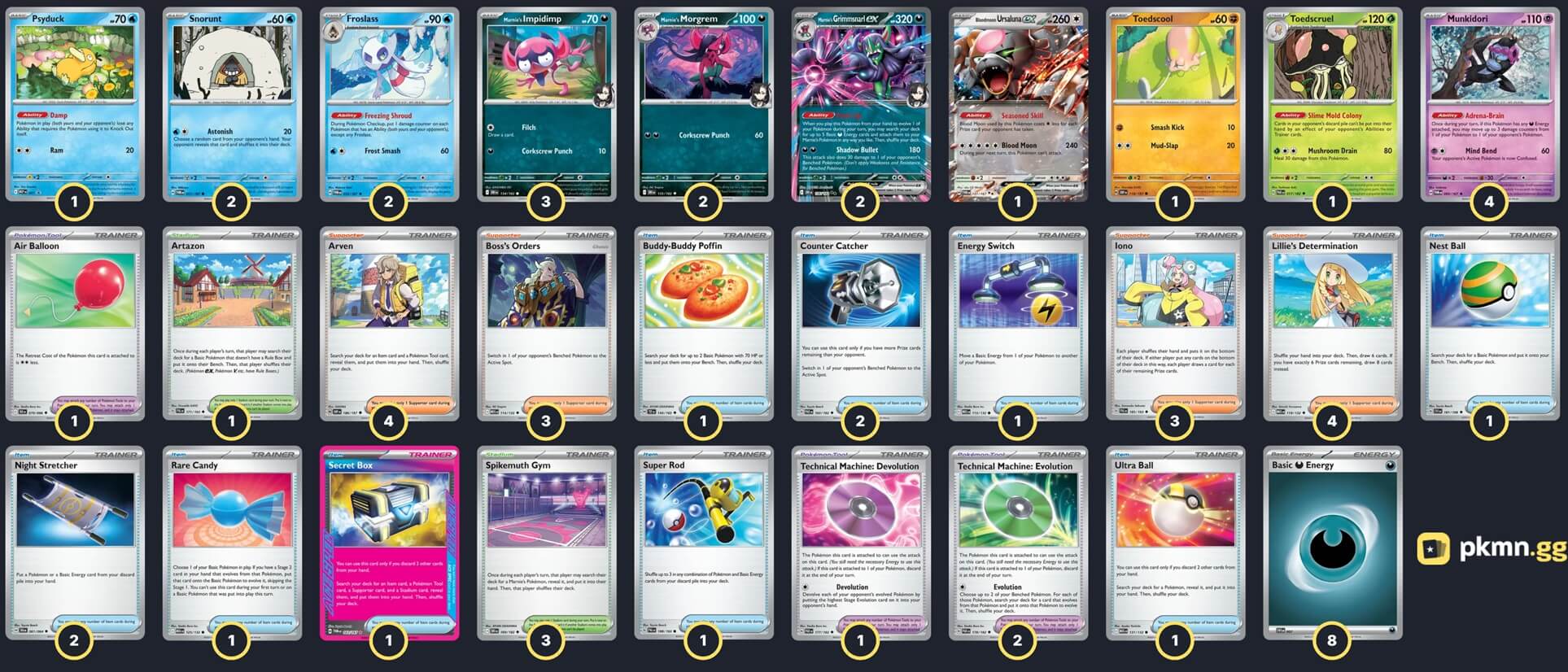 Pokémon: 19 4 Munkidori TWM 95 3 Marnie's Impidimp DRI 134 2 Marnie's Morgrem DRI 135 2 Marnie's Grimmsnarl ex DRI 136 2 Snorunt TWM 51 2 Froslass TWM 53 1 Toedscool OBF 118 1 Toedscruel PAR 17 1 Bloodmoon Ursaluna ex TWM 141 1 Psyduck MEP 7 Trainer: 33 4 Arven OBF 186 4 Lillie's Determination MEG 119 3 Iono PAL 185 3 Boss's Orders MEG 114 2 Night Stretcher SFA 61 2 Counter Catcher PAR 160 1 Rare Candy MEG 125 1 Secret Box TWM 163 1 Ultra Ball MEG 131 1 Super Rod PAL 188 1 Nest Ball SVI 181 1 Energy Switch MEG 115 1 Buddy-Buddy Poffin TEF 144 2 Technical Machine: Evolution PAR 178 1 Technical Machine: Devolution PAR 177 1 Air Balloon BLK 79 3 Spikemuth Gym DRI 169 1 Artazon PAL 171 Energy: 8 8 Darkness Energy MEE 7 |