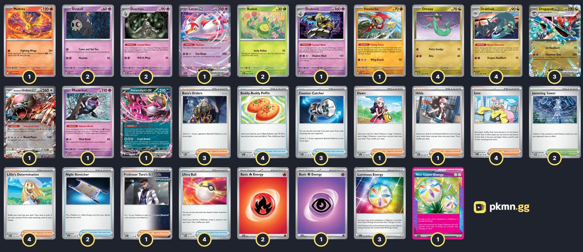 Pokémon: 24 4 Dreepy TWM 128 4 Drakloak TWM 129 3 Dragapult ex TWM 130 2 Duskull PRE 35 2 Dusclops PRE 36 1 Dusknoir PRE 37 2 Budew PRE 4 1 Hawlucha SVI 118 1 Moltres PFL 14 1 Munkidori TWM 95 1 Latias ex SSP 76 1 Bloodmoon Ursaluna ex TWM 141 1 Fezandipiti ex SFA 38 Trainer: 29 4 Lillie's Determination MEG 119 4 Iono PAL 185 3 Boss's Orders MEG 114 1 Hilda WHT 84 1 Dawn PFL 87 1 Professor Turo's Scenario PAR 171 4 Ultra Ball MEG 131 4 Buddy-Buddy Poffin TEF 144 3 Counter Catcher PAR 160 2 Night Stretcher SFA 61 2 Jamming Tower TWM 153 Energy: 7 3 Luminous Energy PAL 191 2 Fire Energy MEE 2 1 Psychic Energy MEE 5 1 Neo Upper Energy TEF 162 |