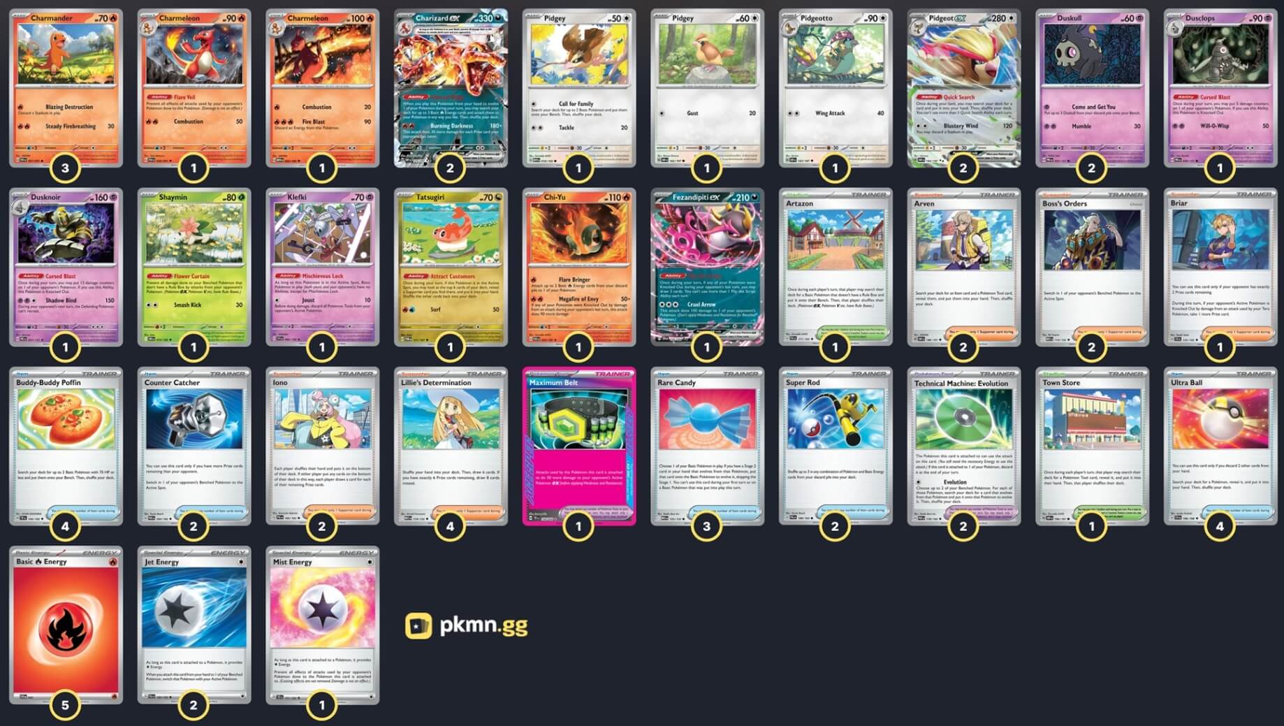 Pokémon: 21 3 Charmander PAF 7 1 Charmeleon MEW 5 1 Charmeleon PAF 8 2 Charizard ex OBF 125 1 Pidgey OBF 162 1 Pidgey MEW 16 1 Pidgeotto OBF 163 2 Pidgeot ex OBF 164 2 Duskull PRE 35 1 Dusclops PRE 36 1 Dusknoir PRE 37 1 Fezandipiti ex SFA 38 1 Chi-Yu PAR 29 1 Tatsugiri TWM 131 1 Shaymin DRI 10 1 Klefki SVI 96 Trainer: 31 4 Lillie's Determination MEG 119 2 Iono PAL 185 2 Arven OBF 186 2 Boss's Orders MEG 114 1 Briar SCR 132 4 Buddy-Buddy Poffin TEF 144 4 Ultra Ball MEG 131 3 Rare Candy MEG 125 2 Super Rod PAL 188 2 Counter Catcher PAR 160 2 Technical Machine: Evolution PAR 178 1 Maximum Belt TEF 154 1 Town Store OBF 196 1 Artazon PAL 171 Energy: 8 5 Fire Energy SVE 18 2 Jet Energy PAL 190 1 Mist Energy TEF 161 |