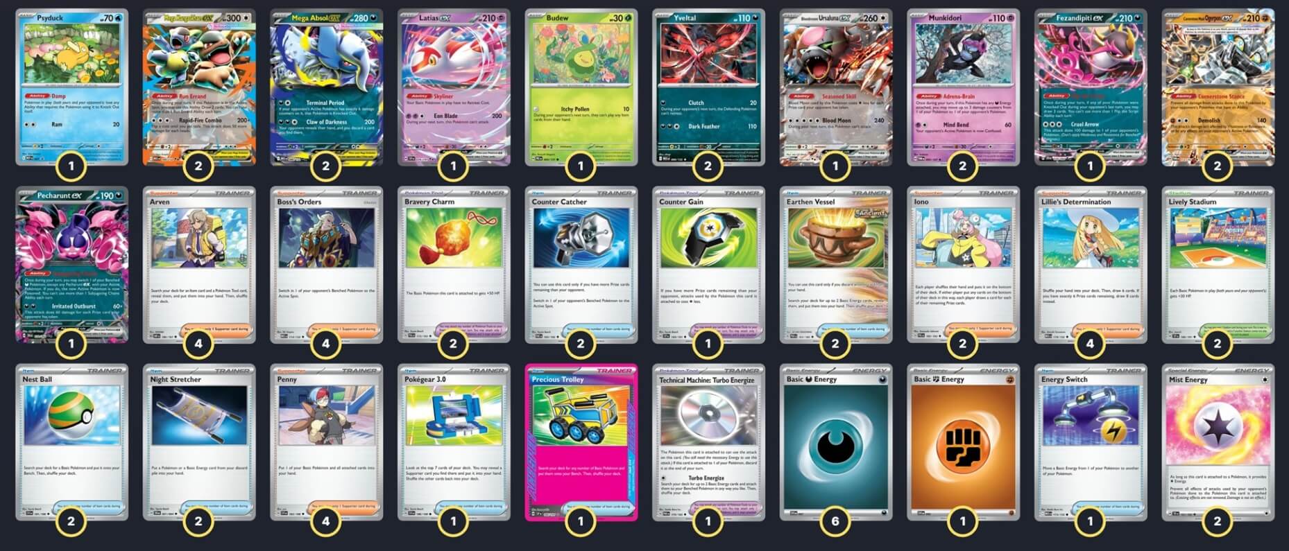 Pokémon: 16 2 Mega Absol ex MEG 86 2 Mega Kangaskhan ex MEG 104 2 Cornerstone Mask Ogerpon ex TWM 112 2 Yveltal MEG 88 2 Munkidori TWM 95 1 Bloodmoon Ursaluna ex TWM 141 1 Latias ex SSP 76 1 Pecharunt ex SFA 39 1 Fezandipiti ex SFA 38 1 Budew PRE 4 1 Psyduck MEP 7 Trainer: 35 4 Arven OBF 186 4 Lillie's Determination MEG 119 4 Boss's Orders MEG 114 4 Penny SVI 183 2 Iono PAL 185 2 Counter Catcher PAR 160 2 Night Stretcher SFA 61 2 Earthen Vessel PAR 163 2 Nest Ball SVI 181 1 Energy Switch MEG 115 1 Pokégear 3.0 SVI 186 1 Precious Trolley SSP 185 2 Bravery Charm PAL 173 1 Counter Gain SSP 169 1 Technical Machine: Turbo Energize PAR 179 2 Lively Stadium SSP 180 Energy: 9 6 Darkness Energy SVE 23 2 Mist Energy TEF 161 1 Fighting Energy SVE 22 |