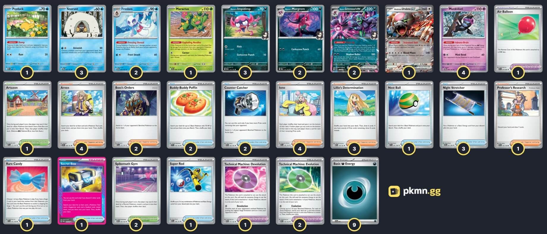 Pokémon: 19 4 Munkidori TWM 95 3 Marnie's Impidimp DRI 134 2 Marnie's Morgrem DRI 135 2 Marnie's Grimmsnarl ex DRI 136 3 Snorunt TWM 51 2 Froslass TWM 53 1 Maractus JTG 8 1 Psyduck MEP 7 1 Bloodmoon Ursaluna ex TWM 141 Trainer: 32 4 Arven OBF 186 4 Iono PAL 185 3 Lillie's Determination MEG 119 2 Boss's Orders PAL 172 1 Professor's Research JTG 155 3 Night Stretcher SFA 61 2 Counter Catcher PAR 160 2 Buddy-Buddy Poffin TEF 144 1 Secret Box TWM 163 1 Super Rod PAL 188 1 Rare Candy SVI 191 1 Nest Ball SVI 181 2 Technical Machine: Evolution PAR 178 1 Technical Machine: Devolution PAR 177 1 Air Balloon BLK 79 2 Spikemuth Gym DRI 169 1 Artazon PAL 171 Energy: 9 9 Darkness Energy SVE 23 |