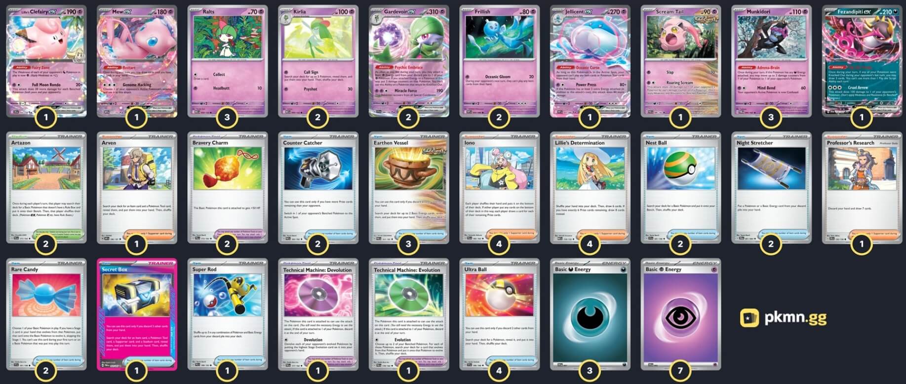 Pokémon: 17 3 Ralts MEG 58 2 Kirlia MEG 59 2 Gardevoir ex SVI 86 3 Munkidori TWM 95 2 Frillish WHT 44 1 Jellicent ex WHT 45 1 Scream Tail PAR 86 1 Lillie's Clefairy ex JTG 56 1 Mew ex MEW 151 1 Fezandipiti ex SFA 38 Trainer: 33 4 Lillie's Determination MEG 119 4 Iono PAL 185 1 Professor's Research JTG 155 1 Arven OBF 186 4 Ultra Ball MEG 131 3 Earthen Vessel PAR 163 2 Nest Ball SVI 181 2 Rare Candy MEG 125 2 Counter Catcher PAR 160 2 Night Stretcher SFA 61 1 Super Rod PAL 188 1 Secret Box TWM 163 2 Bravery Charm PAL 173 1 Technical Machine: Evolution PAR 178 1 Technical Machine: Devolution PAR 177 2 Artazon PAL 171 Energy: 10 7 Psychic Energy SVE 21 3 Darkness Energy SVE 23 |