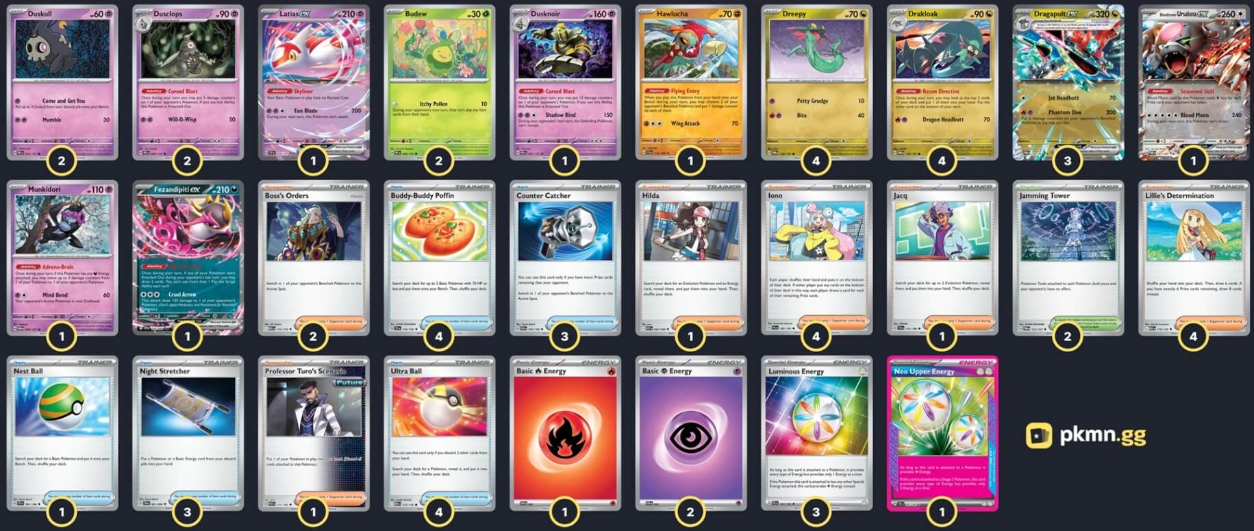 Pokémon: 23 4 Dreepy TWM 128 4 Drakloak TWM 129 3 Dragapult ex TWM 130 2 Duskull PRE 35 2 Dusclops PRE 36 1 Dusknoir PRE 37 2 Budew PRE 4 1 Latias ex SSP 76 1 Bloodmoon Ursaluna ex TWM 141 1 Fezandipiti ex SFA 38 1 Hawlucha SVI 118 1 Munkidori TWM 95 Trainer: 30 4 Iono PAL 185 4 Lillie's Determination MEG 119 2 Boss's Orders MEG 114 1 Professor Turo's Scenario PAR 171 1 Jacq SVI 175 1 Hilda WHT 84 4 Ultra Ball MEG 131 4 Buddy-Buddy Poffin TEF 144 3 Counter Catcher PAR 160 3 Night Stretcher SFA 61 1 Nest Ball SVI 181 2 Jamming Tower TWM 153 Energy: 7 3 Luminous Energy PAL 191 2 Psychic Energy SVE 21 1 Neo Upper Energy TEF 162 1 Fire Energy SVE 18 |