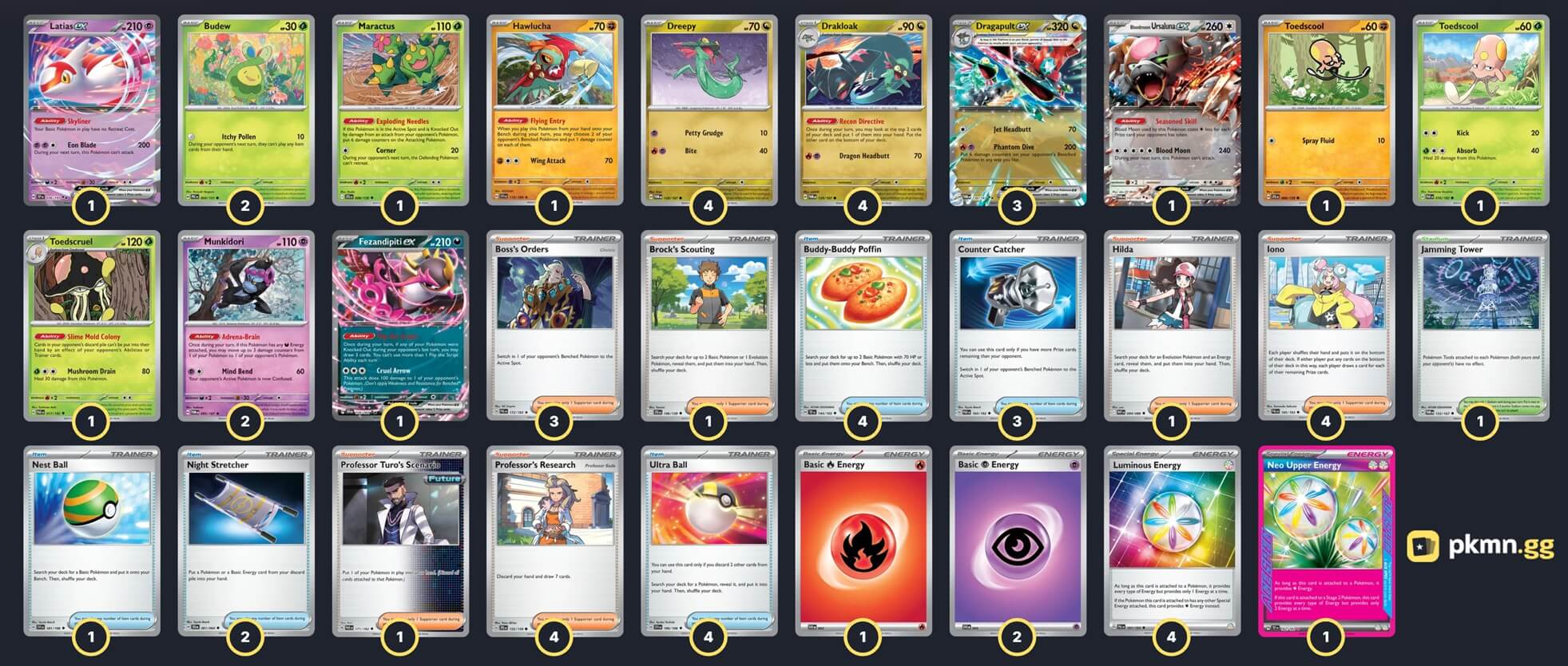 Pokémon: 23 4 Dreepy TWM 128 4 Drakloak TWM 129 3 Dragapult ex TWM 130 1 Toedscool JTG 88 1 Toedscool PAR 16 1 Toedscruel PAR 17 2 Budew PRE 4 2 Munkidori TWM 95 1 Maractus JTG 8 1 Bloodmoon Ursaluna ex TWM 141 1 Latias ex SSP 76 1 Fezandipiti ex SFA 38 1 Hawlucha SVI 118 Trainer: 29 4 Iono PAL 185 4 Professor's Research JTG 155 3 Boss's Orders PAL 172 1 Brock's Scouting JTG 146 1 Hilda WHT 84 1 Professor Turo's Scenario PAR 171 4 Buddy-Buddy Poffin TEF 144 4 Ultra Ball SVI 196 3 Counter Catcher PAR 160 2 Night Stretcher SFA 61 1 Nest Ball SVI 181 1 Jamming Tower TWM 153 Energy: 8 4 Luminous Energy PAL 191 2 Psychic Energy SVE 21 1 Neo Upper Energy TEF 162 1 Fire Energy SVE 18 |