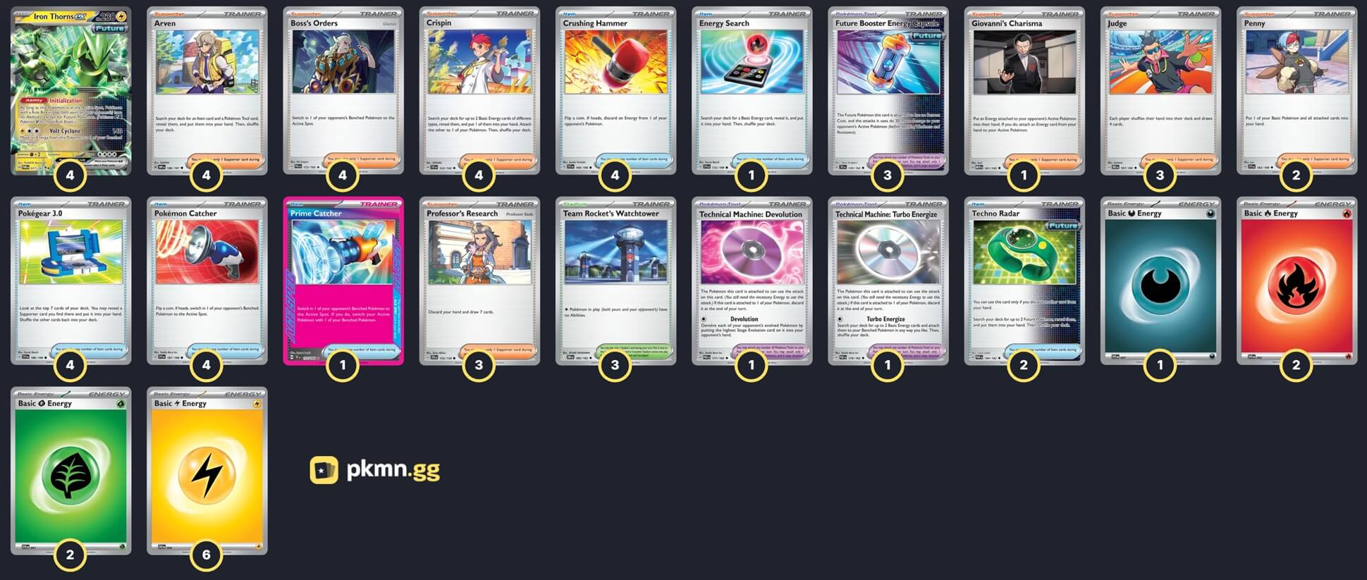 Pokémon: 4 4 Iron Thorns ex TWM 77 Trainer: 45 4 Arven OBF 186 4 Crispin SCR 133 4 Boss's Orders PAL 172 3 Professor's Research JTG 155 3 Judge DRI 167 2 Penny SVI 183 1 Giovanni's Charisma MEW 161 4 Crushing Hammer SVI 168 4 Pokémon Catcher SVI 187 4 Pokégear 3.0 SVI 186 2 Techno Radar PAR 180 1 Energy Search SVI 172 1 Prime Catcher TEF 157 3 Future Booster Energy Capsule TEF 149 1 Technical Machine: Devolution PAR 177 1 Technical Machine: Turbo Energize PAR 179 3 Team Rocket's Watchtower DRI 180 Energy: 11 6 Lightning Energy SVE 20 2 Fire Energy SVE 18 2 Grass Energy SVE 17 1 Darkness Energy SVE 23 |