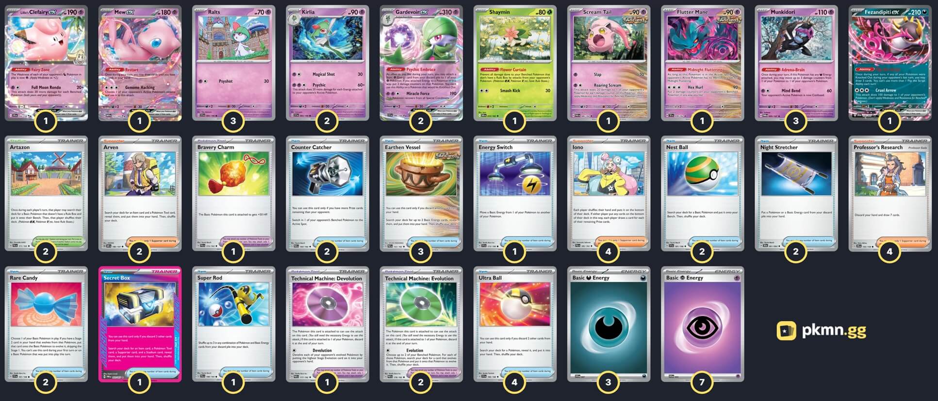 Pokémon: 16 3 Ralts SVI 84 2 Kirlia SVI 85 2 Gardevoir ex SVI 86 3 Munkidori TWM 95 1 Mew ex MEW 151 1 Fezandipiti ex SFA 38 1 Lillie's Clefairy ex JTG 56 1 Flutter Mane TEF 78 1 Scream Tail PAR 86 1 Shaymin DRI 10 Trainer: 34 4 Iono PAL 185 4 Professor's Research JTG 155 2 Arven OBF 186 4 Ultra Ball SVI 196 3 Earthen Vessel PAR 163 2 Nest Ball SVI 181 2 Rare Candy SVI 191 2 Counter Catcher PAR 160 2 Night Stretcher SFA 61 1 Super Rod PAL 188 1 Secret Box TWM 163 1 Energy Switch SVI 173 2 Technical Machine: Evolution PAR 178 1 Technical Machine: Devolution PAR 177 1 Bravery Charm PAL 173 2 Artazon PAL 171 Energy: 10 7 Psychic Energy SVE 21 3 Darkness Energy SVE 23 |