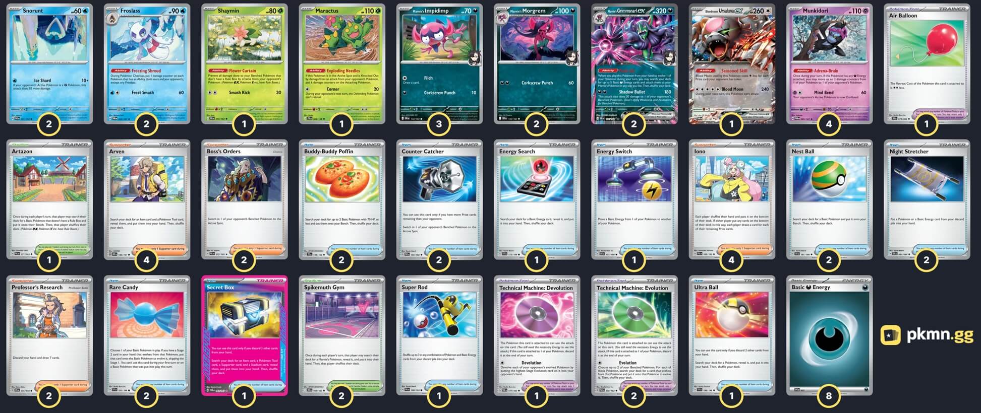 Pokémon: 18 4 Munkidori TWM 95 3 Marnie's Impidimp DRI 134 2 Marnie's Morgrem DRI 135 2 Marnie's Grimmsnarl ex DRI 136 2 Snorunt PAR 37 2 Froslass TWM 53 1 Shaymin DRI 10 1 Bloodmoon Ursaluna ex TWM 141 1 Maractus JTG 8 Trainer: 34 4 Iono PAL 185 4 Arven OBF 186 2 Boss's Orders PAL 172 2 Professor's Research JTG 155 2 Counter Catcher PAR 160 2 Night Stretcher SFA 61 2 Buddy-Buddy Poffin TEF 144 2 Nest Ball SVI 181 2 Rare Candy SVI 191 1 Energy Switch SVI 173 1 Energy Search SVI 172 1 Super Rod PAL 188 1 Ultra Ball SVI 196 1 Secret Box TWM 163 2 Technical Machine: Evolution PAR 178 1 Technical Machine: Devolution PAR 177 1 Air Balloon BLK 79 2 Spikemuth Gym DRI 169 1 Artazon PAL 171 Energy: 8 8 Darkness Energy SVE 23 |
