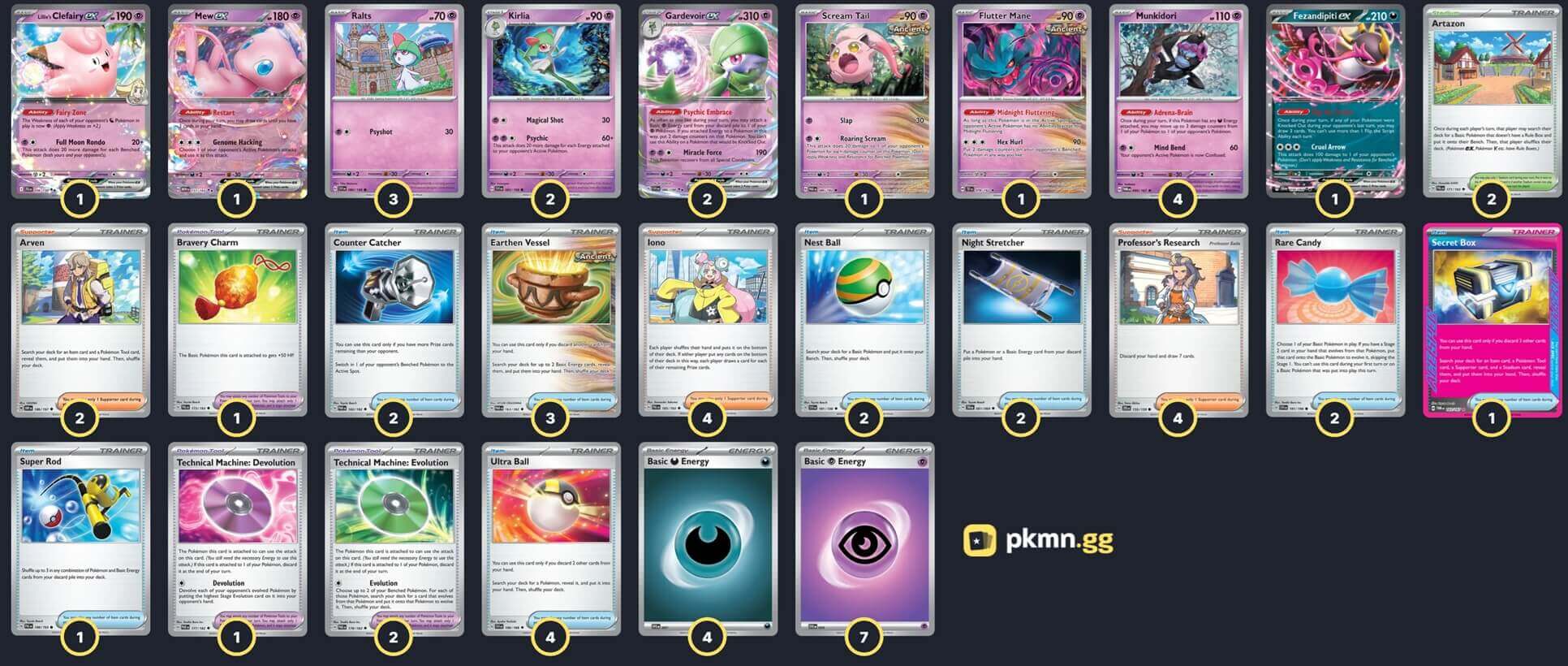 Pokémon: 16 4 Munkidori TWM 95 3 Ralts SVI 84 2 Kirlia SVI 85 2 Gardevoir ex SVI 86 1 Scream Tail PAR 86 1 Fezandipiti ex SFA 38 1 Flutter Mane TEF 78 1 Lillie's Clefairy ex JTG 56 1 Mew ex MEW 151 Trainer: 33 4 Professor's Research JTG 155 4 Iono PAL 185 2 Arven OBF 186 4 Ultra Ball SVI 196 3 Earthen Vessel PAR 163 2 Rare Candy SVI 191 2 Counter Catcher PAR 160 2 Night Stretcher SFA 61 2 Nest Ball SVI 181 1 Super Rod PAL 188 1 Secret Box TWM 163 2 Technical Machine: Evolution PAR 178 1 Technical Machine: Devolution PAR 177 1 Bravery Charm PAL 173 2 Artazon PAL 171 Energy: 11 7 Psychic Energy SVE 13 4 Darkness Energy SVE 15 |