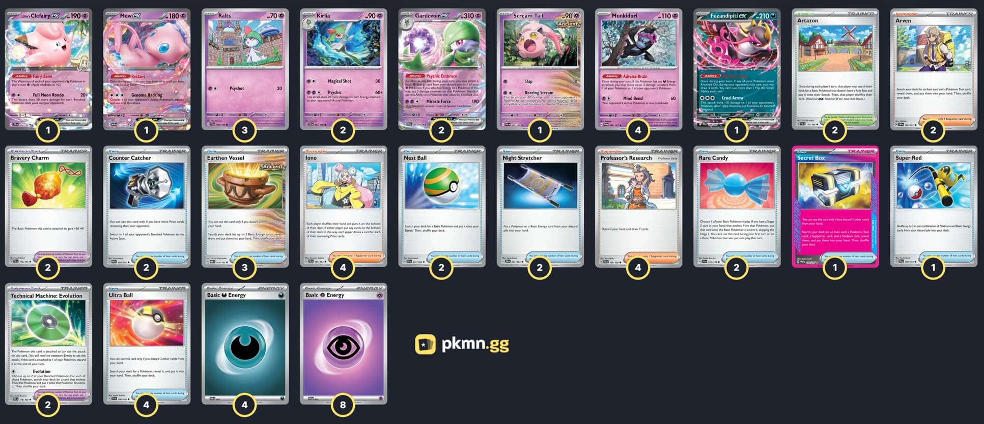 Pokémon: 15 4 Munkidori TWM 95 3 Ralts SVI 84 2 Kirlia SVI 85 2 Gardevoir ex SVI 86 1 Lillie's Clefairy ex JTG 56 1 Mew ex MEW 151 1 Fezandipiti ex SFA 38 1 Scream Tail PAR 86 Trainer: 33 4 Iono PAL 185 4 Professor's Research JTG 155 2 Arven OBF 186 4 Ultra Ball SVI 196 3 Earthen Vessel PAR 163 2 Nest Ball SVI 181 2 Rare Candy SVI 191 2 Night Stretcher SFA 61 2 Counter Catcher PAR 160 1 Secret Box TWM 163 1 Super Rod PAL 188 2 Technical Machine: Evolution PAR 178 2 Bravery Charm PAL 173 2 Artazon PAL 171 Energy: 12 8 Psychic Energy SVE 21 4 Darkness Energy SVE 23 |