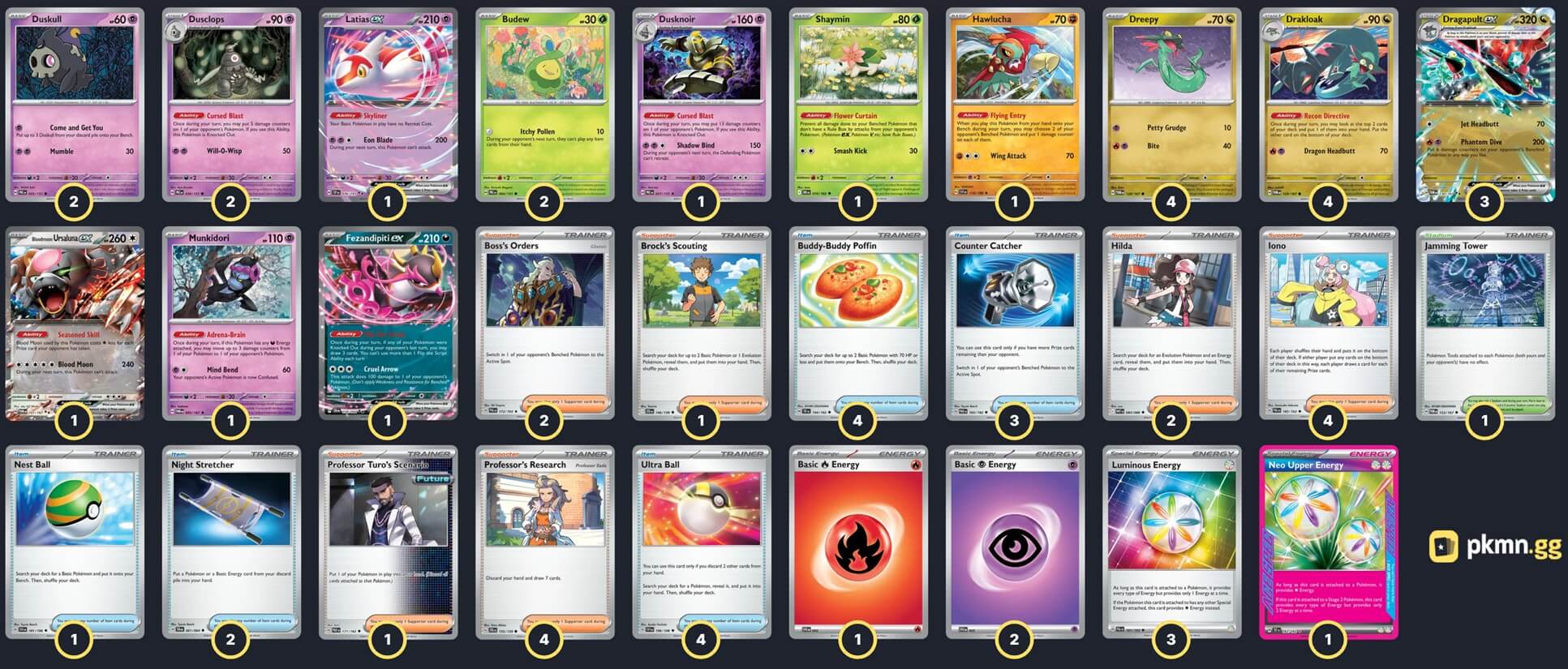 Pokémon: 24 4 Dreepy TWM 128 4 Drakloak TWM 129 3 Dragapult ex TWM 130 2 Duskull PRE 35 2 Dusclops PRE 36 1 Dusknoir PRE 37 2 Budew PRE 4 1 Munkidori TWM 95 1 Latias ex SSP 76 1 Fezandipiti ex SFA 38 1 Hawlucha SVI 118 1 Shaymin DRI 10 1 Bloodmoon Ursaluna ex TWM 141 Trainer: 29 4 Professor's Research JTG 155 4 Iono PAL 185 2 Boss's Orders PAL 172 2 Hilda WHT 84 1 Brock's Scouting JTG 146 1 Professor Turo's Scenario PAR 171 4 Ultra Ball SVI 196 4 Buddy-Buddy Poffin TEF 144 3 Counter Catcher PAR 160 2 Night Stretcher SFA 61 1 Nest Ball SVI 181 1 Jamming Tower TWM 153 Energy: 7 3 Luminous Energy PAL 191 2 Psychic Energy SVE 21 1 Fire Energy SVE 18 1 Neo Upper Energy TEF 162 |