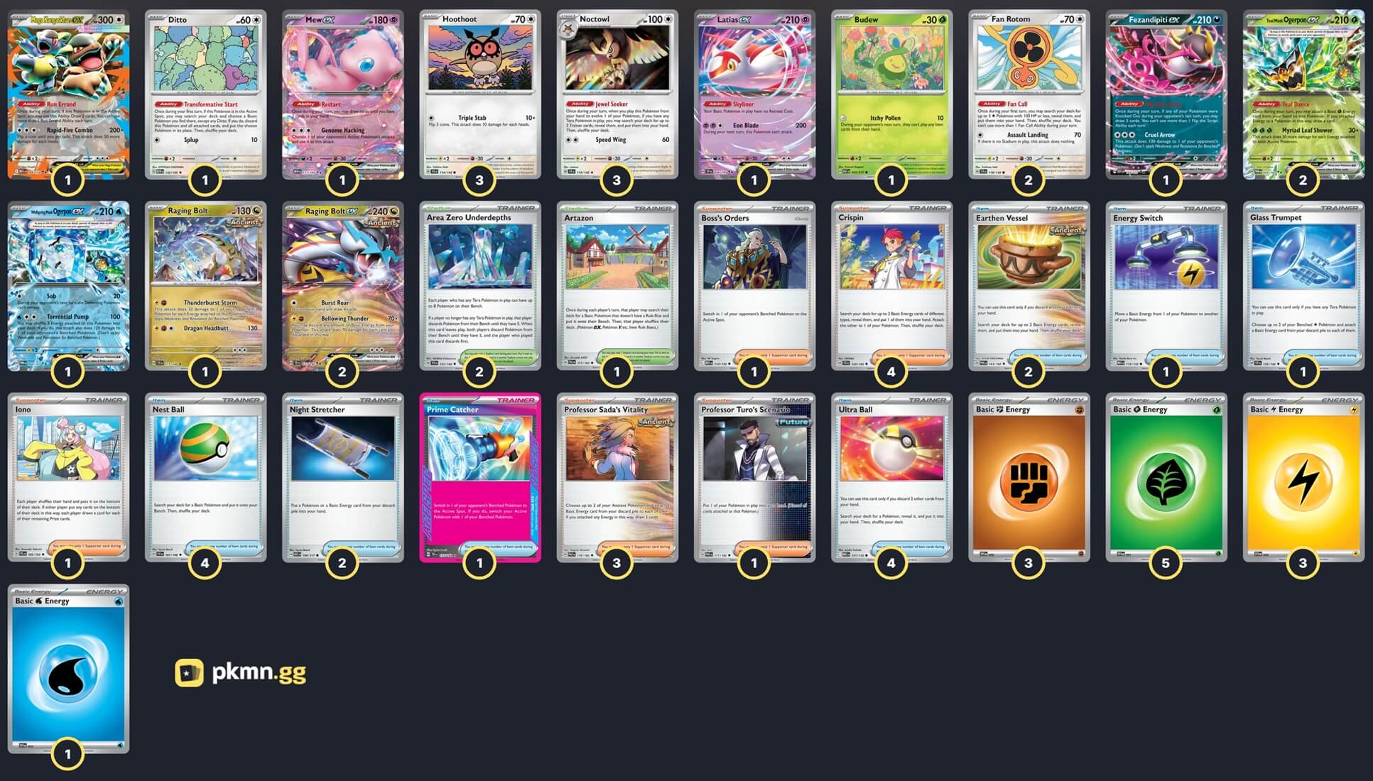 Pokémon: 20 3 Hoothoot SCR 114 3 Noctowl SCR 115 2 Teal Mask Ogerpon ex TWM 25 2 Raging Bolt ex TEF 123 2 Fan Rotom SCR 118 1 Ditto MEW 132 1 Mew ex MEW 151 1 Wellspring Mask Ogerpon ex TWM 64 1 Fezandipiti ex ASC 142 1 Raging Bolt SCR 111 1 Latias ex SSP 76 1 Mega Kangaskhan ex MEG 104 1 Budew ASC 16 Trainer: 28 4 Crispin SCR 133 3 Professor Sada's Vitality PAR 170 1 Boss's Orders MEG 114 1 Professor Turo's Scenario PAR 171 1 Iono PAL 185 4 Nest Ball SVI 181 4 Ultra Ball MEG 131 2 Earthen Vessel PAR 163 2 Night Stretcher ASC 196 1 Energy Switch MEG 115 1 Prime Catcher TEF 157 1 Glass Trumpet SCR 135 2 Area Zero Underdepths SCR 131 1 Artazon PAL 171 Energy: 12 5 Grass Energy MEE 1 3 Fighting Energy MEE 6 3 Lightning Energy MEE 4 1 Water Energy MEE 3 |