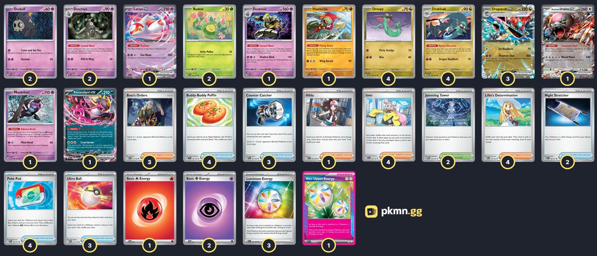 Pokémon: 23 4 Dreepy TWM 128 4 Drakloak TWM 129 3 Dragapult ex TWM 130 2 Duskull PRE 35 2 Dusclops PRE 36 1 Dusknoir PRE 37 2 Budew ASC 16 1 Bloodmoon Ursaluna ex TWM 141 1 Fezandipiti ex ASC 142 1 Latias ex SSP 76 1 Munkidori TWM 95 1 Hawlucha SVI 118 Trainer: 30 4 Lillie's Determination MEG 119 4 Iono PAL 185 3 Boss's Orders MEG 114 1 Hilda WHT 84 4 Buddy-Buddy Poffin TEF 144 4 Poké Pad ASC 198 3 Counter Catcher PAR 160 3 Ultra Ball MEG 131 2 Night Stretcher ASC 196 2 Jamming Tower TWM 153 Energy: 7 3 Luminous Energy PAL 191 2 Psychic Energy MEE 5 1 Fire Energy MEE 2 1 Neo Upper Energy TEF 162 |