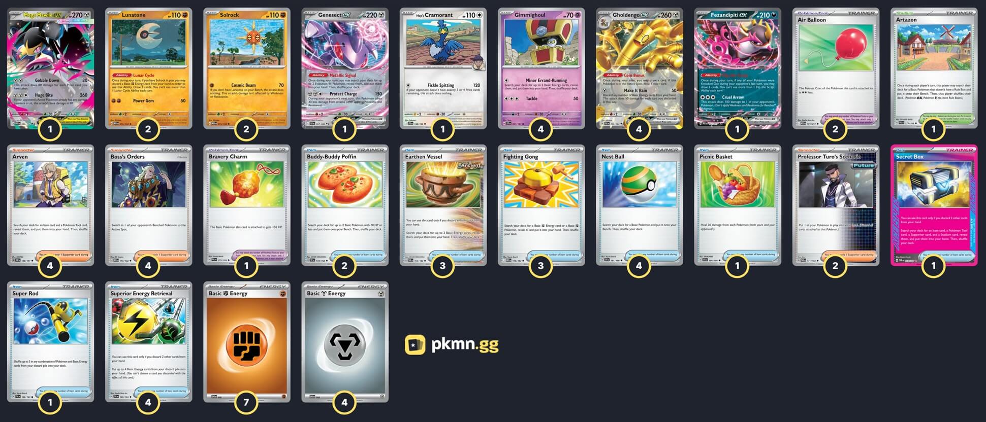 Pokémon: 16 4 Gimmighoul SSP 97 4 Gholdengo ex PAR 139 2 Solrock MEG 75 2 Lunatone MEG 74 1 Fezandipiti ex ASC 142 1 Mega Mawile ex MEG 94 1 Hop's Cramorant JTG 138 1 Genesect ex BLK 67 Trainer: 33 4 Boss's Orders MEG 114 4 Arven OBF 186 2 Professor Turo's Scenario PAR 171 4 Nest Ball SVI 181 4 Superior Energy Retrieval PAL 189 3 Fighting Gong MEG 116 3 Earthen Vessel PAR 163 2 Buddy-Buddy Poffin TEF 144 1 Super Rod PAL 188 1 Secret Box TWM 163 1 Picnic Basket SVI 184 2 Air Balloon ASC 181 1 Bravery Charm PAL 173 1 Artazon PAL 171 Energy: 11 7 Fighting Energy MEE 6 4 Metal Energy MEE 8 |