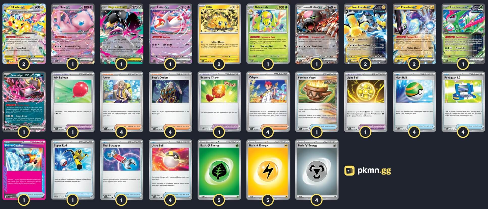 Pokémon: 15 2 Joltik SCR 50 1 Galvantula SFA 2 2 Pikachu ex SSP 57 2 Iron Hands ex PAR 70 2 Miraidon ex SVI 81 1 Latias ex SSP 76 1 Mega Mawile ex MEG 94 1 Bloodmoon Ursaluna ex TWM 141 1 Fezandipiti ex ASC 142 1 Mew ex MEW 151 1 Iron Leaves ex TEF 25 Trainer: 31 4 Arven OBF 186 4 Boss's Orders MEG 114 4 Crispin SCR 133 4 Nest Ball SVI 181 4 Pokégear 3.0 SVI 186 4 Ultra Ball MEG 131 1 Earthen Vessel PAR 163 1 Prime Catcher TEF 157 1 Super Rod PAL 188 1 Tool Scrapper ASC 212 1 Air Balloon ASC 181 1 Bravery Charm PAL 173 1 Light Ball ASC 191 Energy: 14 5 Lightning Energy MEE 4 5 Grass Energy MEE 1 4 Metal Energy MEE 8 |