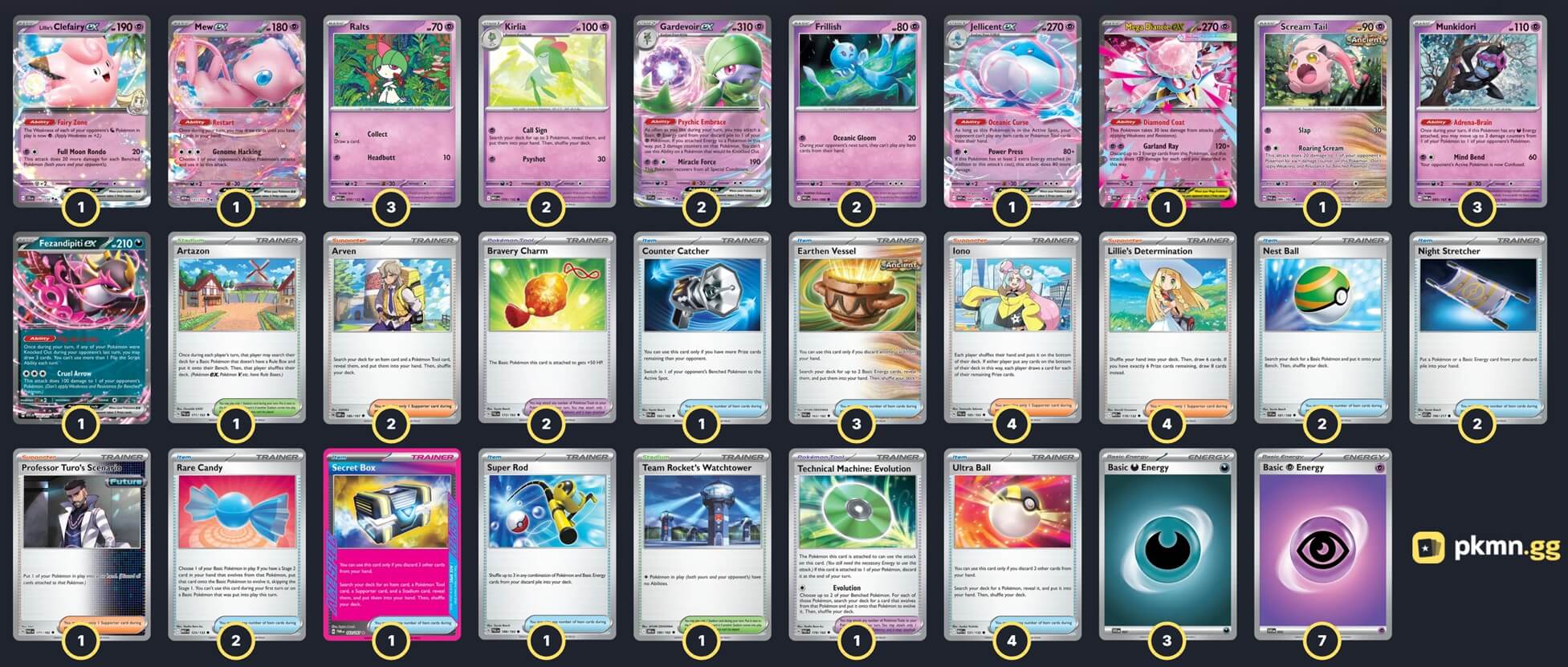 Pokémon: 18 3 Ralts MEG 58 2 Kirlia MEG 59 2 Gardevoir ex SVI 86 3 Munkidori TWM 95 2 Frillish WHT 44 1 Jellicent ex WHT 45 1 Lillie's Clefairy ex JTG 56 1 Mega Diancie ex PFL 41 1 Mew ex MEW 151 1 Scream Tail PAR 86 1 Fezandipiti ex ASC 142 Trainer: 32 4 Iono PAL 185 4 Lillie's Determination MEG 119 2 Arven OBF 186 1 Professor Turo's Scenario PAR 171 4 Ultra Ball MEG 131 3 Earthen Vessel PAR 163 2 Night Stretcher ASC 196 2 Nest Ball SVI 181 2 Rare Candy MEG 125 1 Super Rod PAL 188 1 Counter Catcher PAR 160 1 Secret Box TWM 163 2 Bravery Charm PAL 173 1 Technical Machine: Evolution PAR 178 1 Team Rocket's Watchtower DRI 180 1 Artazon PAL 171 Energy: 10 7 Psychic Energy MEE 5 3 Darkness Energy MEE 7 |