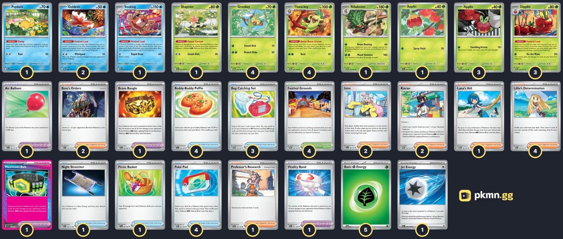 Pokémon: 21 4 Grookey TWM 14 4 Thwackey TWM 15 1 Rillaboom TWM 16 3 Applin TWM 17 1 Applin SCR 12 3 Dipplin TWM 18 2 Goldeen TWM 44 1 Seaking PRE 21 1 Psyduck ASC 39 1 Shaymin DRI 10 Trainer: 33 4 Lillie's Determination MEG 119 2 Kieran TWM 154 2 Boss's Orders MEG 114 2 Iono PAL 185 1 Professor's Research JTG 155 1 Lana's Aid TWM 155 4 Buddy-Buddy Poffin TEF 144 4 Poké Pad POR 81 3 Bug Catching Set TWM 143 1 Picnic Basket SVI 184 1 Night Stretcher ASC 196 1 Air Balloon ASC 181 1 Vitality Band SVI 197 1 Brave Bangle WHT 80 1 Maximum Belt TEF 154 4 Festival Grounds TWM 149 Energy: 6 5 Grass Energy MEE 1 1 Jet Energy PAL 190 |