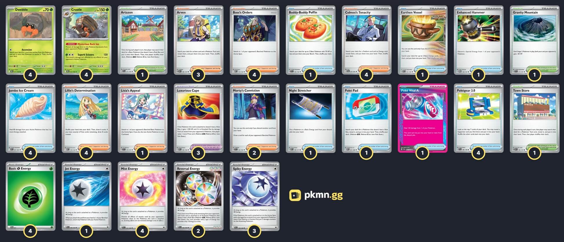 Pokémon: 8 4 Dwebble DRI 11 4 Crustle DRI 12 Trainer: 38 4 Lillie's Determination MEG 119 4 Boss's Orders MEG 114 4 Colress's Tenacity SFA 57 3 Arven OBF 186 2 Morty's Conviction TEF 155 1 Lisia's Appeal SSP 179 4 Pokégear 3.0 SVI 186 4 Jumbo Ice Cream PFL 91 1 Poké Pad POR 81 1 Night Stretcher ASC 196 1 Buddy-Buddy Poffin TEF 144 1 Earthen Vessel PAR 163 1 Enhanced Hammer TWM 148 1 Poké Vital A SFA 62 3 Luxurious Cape PAR 166 1 Artazon PAL 171 1 Town Store OBF 196 1 Gravity Mountain SSP 177 Energy: 14 4 Grass Energy MEE 1 4 Mist Energy TEF 161 3 Spiky Energy JTG 159 2 Reversal Energy PAL 192 1 Jet Energy PAL 190 |