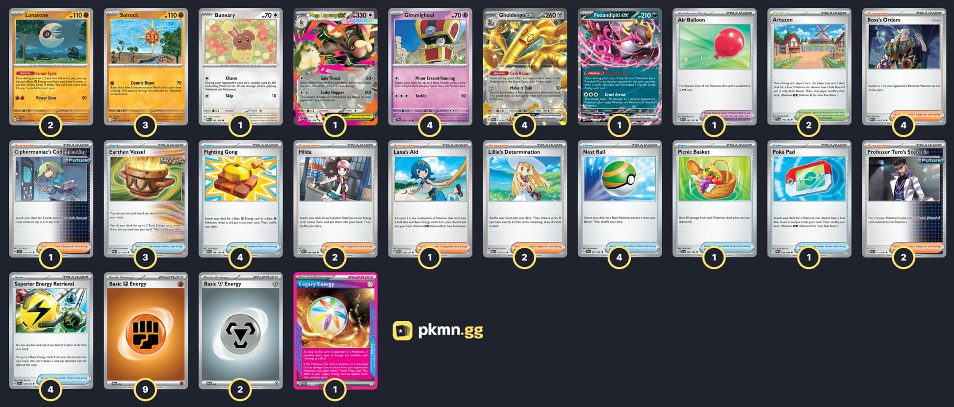 Pokémon: 16 4 Gimmighoul SSP 97 4 Gholdengo ex PAR 139 3 Solrock MEG 75 2 Lunatone MEG 74 1 Buneary MEG 107 1 Mega Lopunny ex PFL 84 1 Fezandipiti ex ASC 142 Trainer: 32 4 Boss's Orders MEG 114 2 Professor Turo's Scenario PAR 171 2 Lillie's Determination MEG 119 2 Hilda WHT 84 1 Lana's Aid TWM 155 1 Ciphermaniac's Codebreaking TEF 145 4 Fighting Gong MEG 116 4 Nest Ball SVI 181 4 Superior Energy Retrieval PAL 189 3 Earthen Vessel PAR 163 1 Picnic Basket SVI 184 1 Poké Pad POR 81 1 Air Balloon ASC 181 2 Artazon PAL 171 Energy: 12 9 Fighting Energy MEE 6 2 Metal Energy MEE 8 1 Legacy Energy TWM 167 |