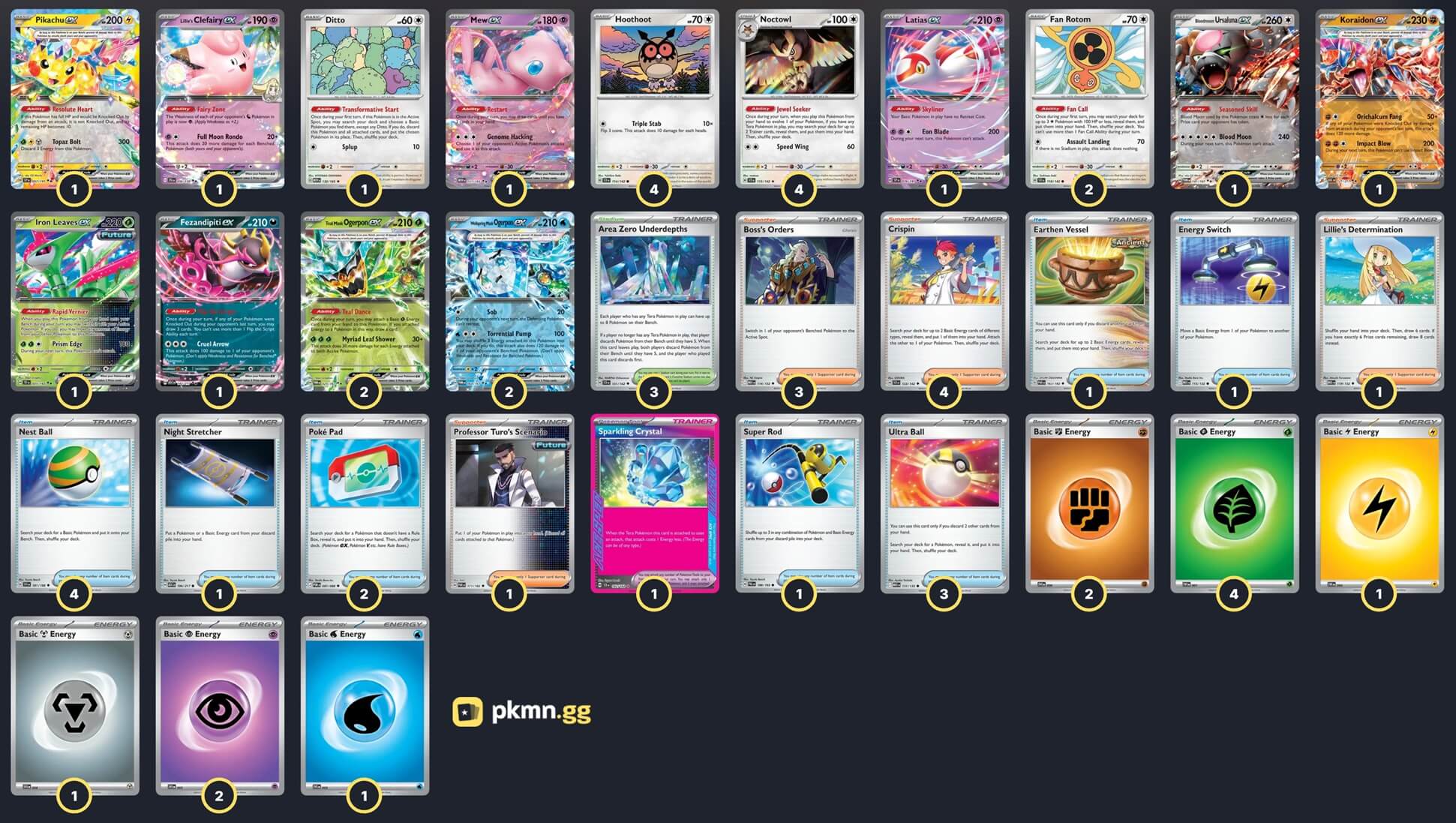 Pokémon: 23 4 Hoothoot SCR 114 4 Noctowl SCR 115 2 Wellspring Mask Ogerpon ex TWM 64 2 Teal Mask Ogerpon ex TWM 25 2 Fan Rotom SCR 118 1 Iron Leaves ex TEF 25 1 Mew ex MEW 151 1 Koraidon ex ASC 121 1 Pikachu ex SSP 57 1 Ditto MEW 132 1 Latias ex SSP 76 1 Fezandipiti ex ASC 142 1 Lillie's Clefairy ex JTG 56 1 Bloodmoon Ursaluna ex TWM 141 Trainer: 26 4 Crispin SCR 133 3 Boss's Orders MEG 114 1 Professor Turo's Scenario PAR 171 1 Lillie's Determination MEG 119 4 Nest Ball SVI 181 3 Ultra Ball MEG 131 2 Poké Pad POR 81 1 Super Rod PAL 188 1 Energy Switch MEG 115 1 Night Stretcher ASC 196 1 Earthen Vessel PAR 163 1 Sparkling Crystal SCR 142 3 Area Zero Underdepths SCR 131 Energy: 11 4 Grass Energy MEE 1 2 Psychic Energy MEE 5 2 Fighting Energy MEE 6 1 Water Energy MEE 3 1 Metal Energy MEE 8 1 Lightning Energy MEE 4 |