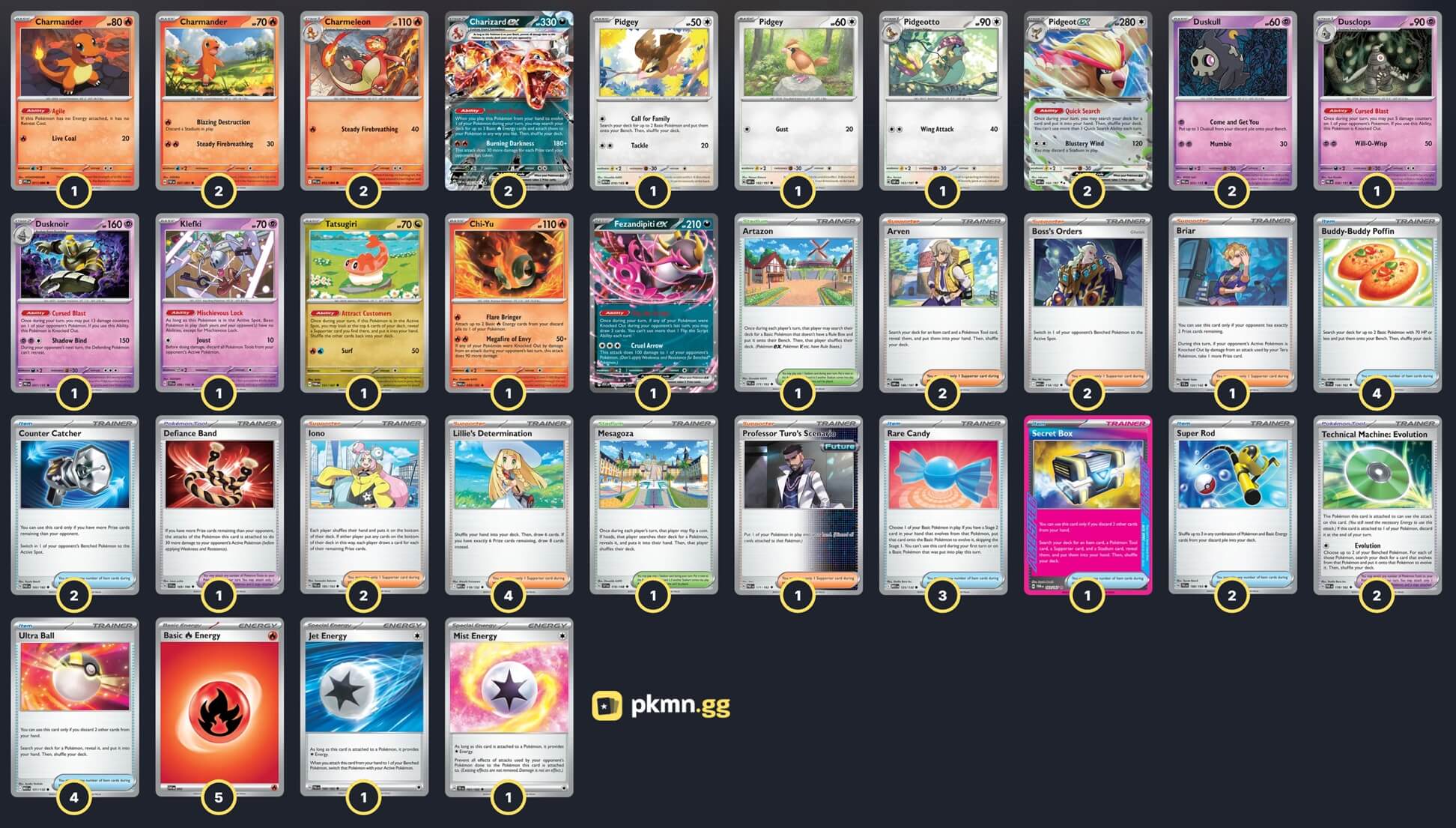 Pokémon: 20 2 Charmander PAF 7 1 Charmander PFL 11 2 Charmeleon PFL 12 2 Charizard ex OBF 125 2 Duskull PRE 35 1 Dusclops PRE 36 1 Dusknoir PRE 37 1 Pidgey MEW 16 1 Pidgey OBF 162 1 Pidgeotto OBF 163 2 Pidgeot ex OBF 164 1 Fezandipiti ex ASC 142 1 Tatsugiri TWM 131 1 Chi-Yu PAR 29 1 Klefki SVI 96 Trainer: 33 4 Lillie's Determination MEG 119 2 Arven OBF 186 2 Iono PAL 185 2 Boss's Orders MEG 114 1 Professor Turo's Scenario PAR 171 1 Briar SCR 132 4 Ultra Ball MEG 131 4 Buddy-Buddy Poffin TEF 144 3 Rare Candy MEG 125 2 Counter Catcher PAR 160 2 Super Rod PAL 188 1 Secret Box TWM 163 2 Technical Machine: Evolution PAR 178 1 Defiance Band SVI 169 1 Mesagoza SVI 178 1 Artazon PAL 171 Energy: 7 5 Fire Energy MEE 2 1 Mist Energy TEF 161 1 Jet Energy PAL 190 |
