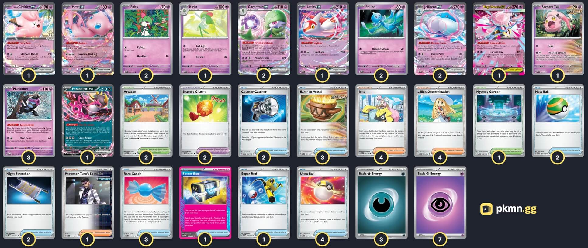 Pokémon: 18 3 Munkidori TWM 95 2 Ralts MEG 58 1 Kirlia MEG 59 2 Gardevoir ex SVI 86 2 Frillish WHT 44 2 Jellicent ex WHT 45 1 Mega Diancie ex PFL 41 1 Latias ex SSP 76 1 Fezandipiti ex SFA 38 1 Lillie's Clefairy ex JTG 56 1 Mew ex MEW 151 1 Scream Tail PAR 86 Trainer: 32 4 Iono PAL 185 4 Lillie's Determination MEG 119 1 Professor Turo's Scenario PAR 171 4 Ultra Ball MEG 131 3 Rare Candy MEG 125 3 Earthen Vessel PAR 163 2 Nest Ball SVI 181 2 Counter Catcher PAR 160 2 Night Stretcher SFA 61 1 Super Rod PAL 188 1 Secret Box TWM 163 2 Bravery Charm PAL 173 2 Artazon PAL 171 1 Mystery Garden MEG 122 Energy: 10 7 Psychic Energy MEE 5 3 Darkness Energy MEE 7 |