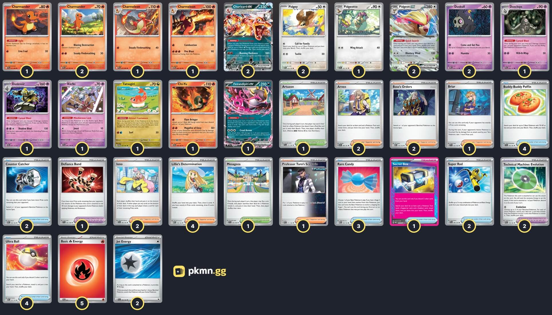 Pokémon: 20 2 Charmander PAF 7 1 Charmander PFL 11 1 Charmeleon PFL 12 1 Charmeleon MEW 5 2 Charizard ex OBF 125 2 Pidgey MEW 16 1 Pidgeotto OBF 163 2 Pidgeot ex OBF 164 2 Duskull PRE 35 1 Dusclops PRE 36 1 Dusknoir PRE 37 1 Chi-Yu PAR 29 1 Fezandipiti ex SFA 38 1 Klefki SVI 96 1 Tatsugiri TWM 131 Trainer: 33 4 Lillie's Determination MEG 119 2 Arven OBF 186 2 Iono PAL 185 2 Boss's Orders MEG 114 1 Professor Turo's Scenario PAR 171 1 Briar SCR 132 4 Buddy-Buddy Poffin TEF 144 4 Ultra Ball MEG 131 3 Rare Candy MEG 125 2 Counter Catcher PAR 160 2 Super Rod PAL 188 1 Secret Box TWM 163 2 Technical Machine: Evolution PAR 178 1 Defiance Band SVI 169 1 Mesagoza SVI 178 1 Artazon PAL 171 Energy: 7 5 Fire Energy MEE 2 2 Jet Energy PAL 190 |