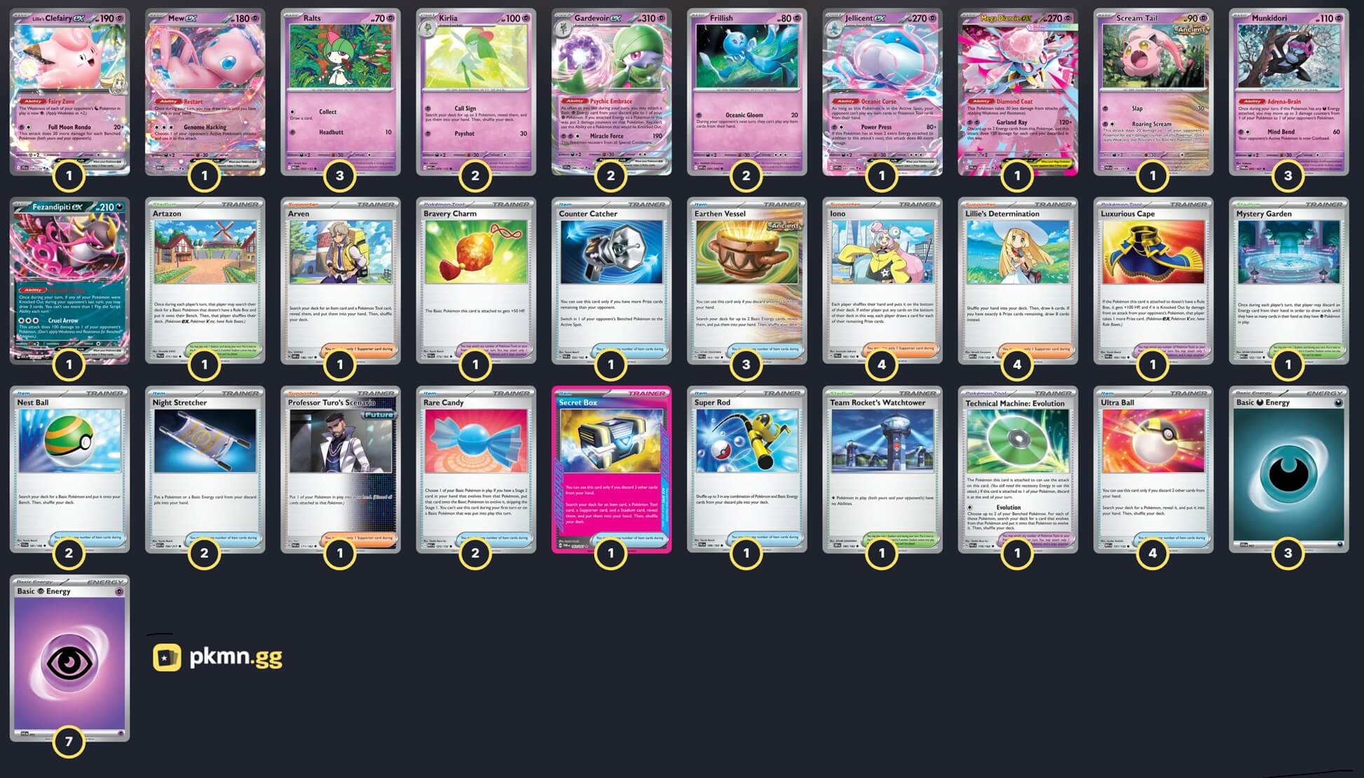 Pokémon: 18 3 Ralts MEG 58 2 Kirlia MEG 59 2 Gardevoir ex SVI 86 3 Munkidori TWM 95 2 Frillish WHT 44 1 Jellicent ex WHT 45 1 Scream Tail PAR 86 1 Mega Diancie ex PFL 41 1 Lillie's Clefairy ex JTG 56 1 Mew ex MEW 151 1 Fezandipiti ex ASC 142 Trainer: 32 4 Lillie's Determination MEG 119 4 Iono PAL 185 1 Arven OBF 186 1 Professor Turo's Scenario PAR 171 4 Ultra Ball MEG 131 3 Earthen Vessel PAR 163 2 Nest Ball SVI 181 2 Rare Candy MEG 125 2 Night Stretcher ASC 196 1 Secret Box TWM 163 1 Counter Catcher PAR 160 1 Super Rod PAL 188 1 Technical Machine: Evolution PAR 178 1 Luxurious Cape PAR 166 1 Bravery Charm PAL 173 1 Artazon PAL 171 1 Mystery Garden MEG 122 1 Team Rocket's Watchtower DRI 180 Energy: 10 7 Psychic Energy MEE 5 3 Darkness Energy MEE 7 |