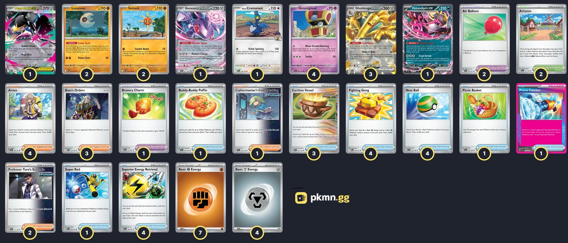 Pokémon: 15 4 Gimmighoul SSP 97 3 Gholdengo ex PAR 139 2 Solrock MEG 75 2 Lunatone MEG 74 1 Genesect ex BLK 67 1 Fezandipiti ex ASC 142 1 Mega Mawile ex MEG 94 1 Hop's Cramorant JTG 138 Trainer: 34 4 Arven OBF 186 3 Boss's Orders MEG 114 2 Professor Turo's Scenario PAR 171 1 Ciphermaniac's Codebreaking TEF 145 4 Superior Energy Retrieval PAL 189 4 Fighting Gong MEG 116 4 Nest Ball SVI 181 3 Earthen Vessel PAR 163 1 Buddy-Buddy Poffin TEF 144 1 Super Rod PAL 188 1 Picnic Basket SVI 184 1 Prime Catcher TEF 157 2 Air Balloon ASC 181 1 Bravery Charm PAL 173 2 Artazon PAL 171 Energy: 11 7 Fighting Energy MEE 6 4 Metal Energy MEE 8 |