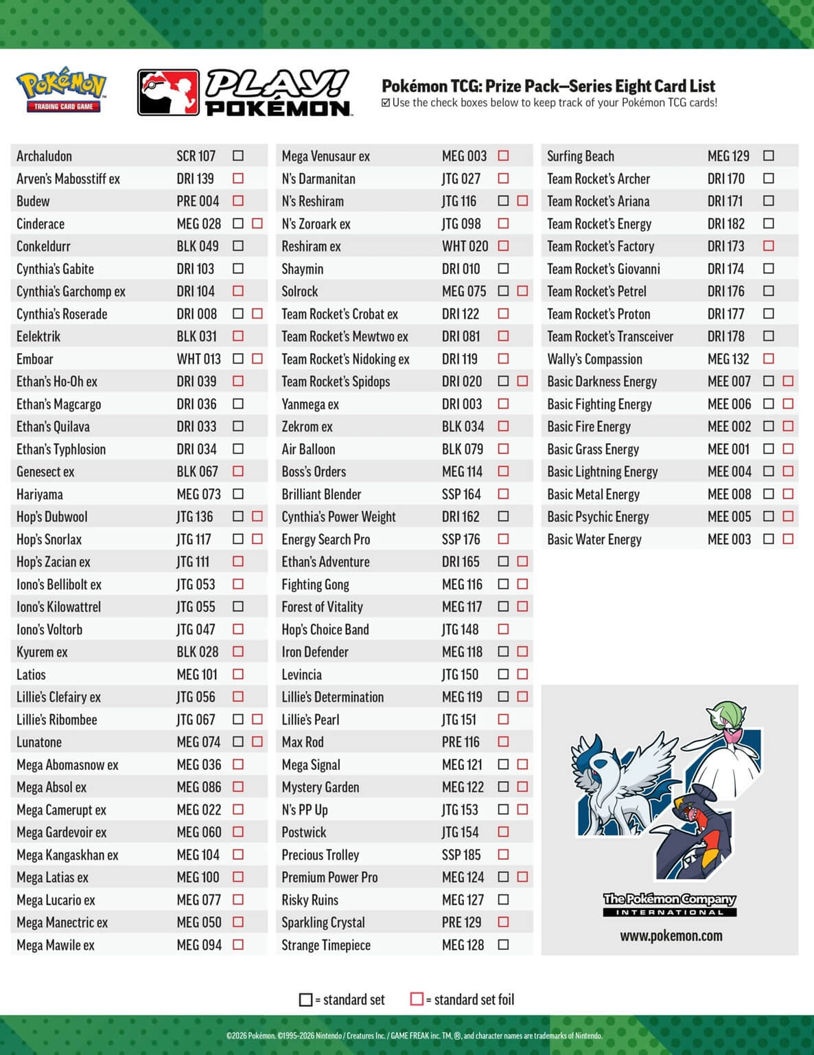Prize Pack Series 8 will be releasing on January 1, 2026. The booster packs will feature cards from Destined Rivals, Black Bolt, White Flare, and Mega Evolution. For the entire list, click here.